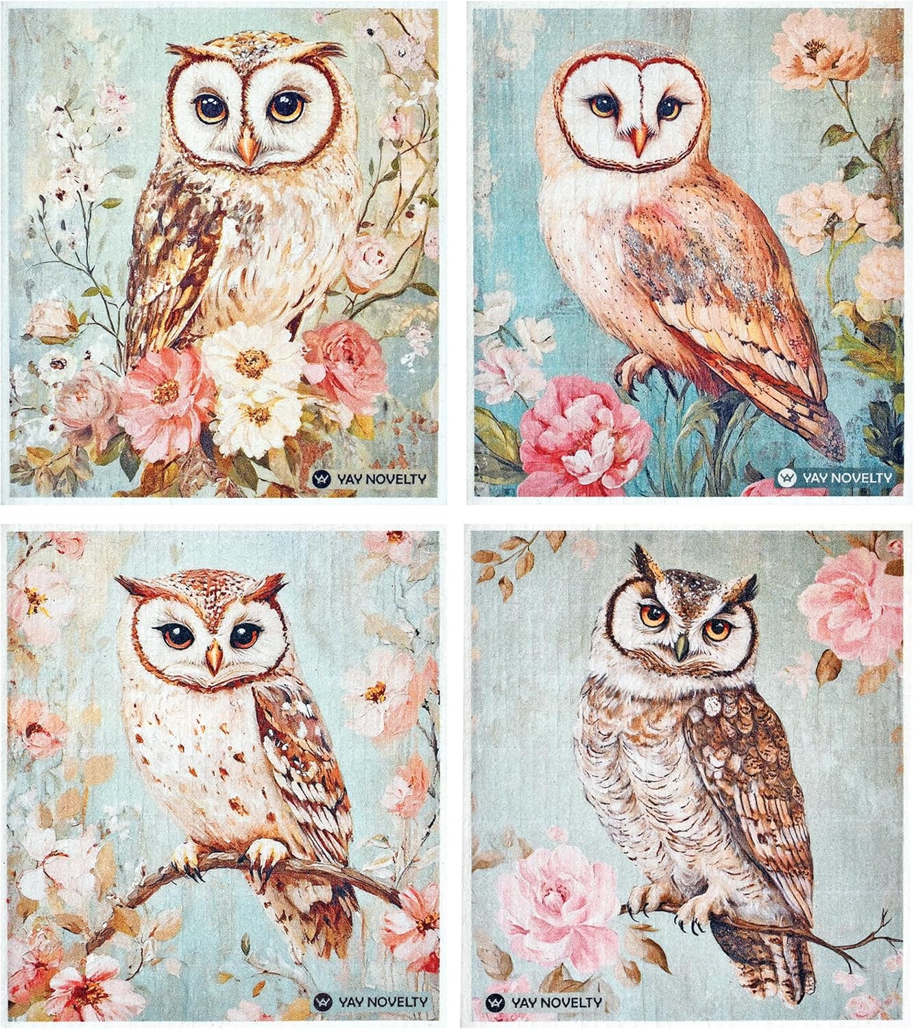 12 Pack German Swedish DishCloths, Paper Towels Alternative – Washable, Eco-Friendly Cellulose Sponge Dish Cloths, Reusable Cleaning Cloths – Kitchen Essentials – Vintage Owl