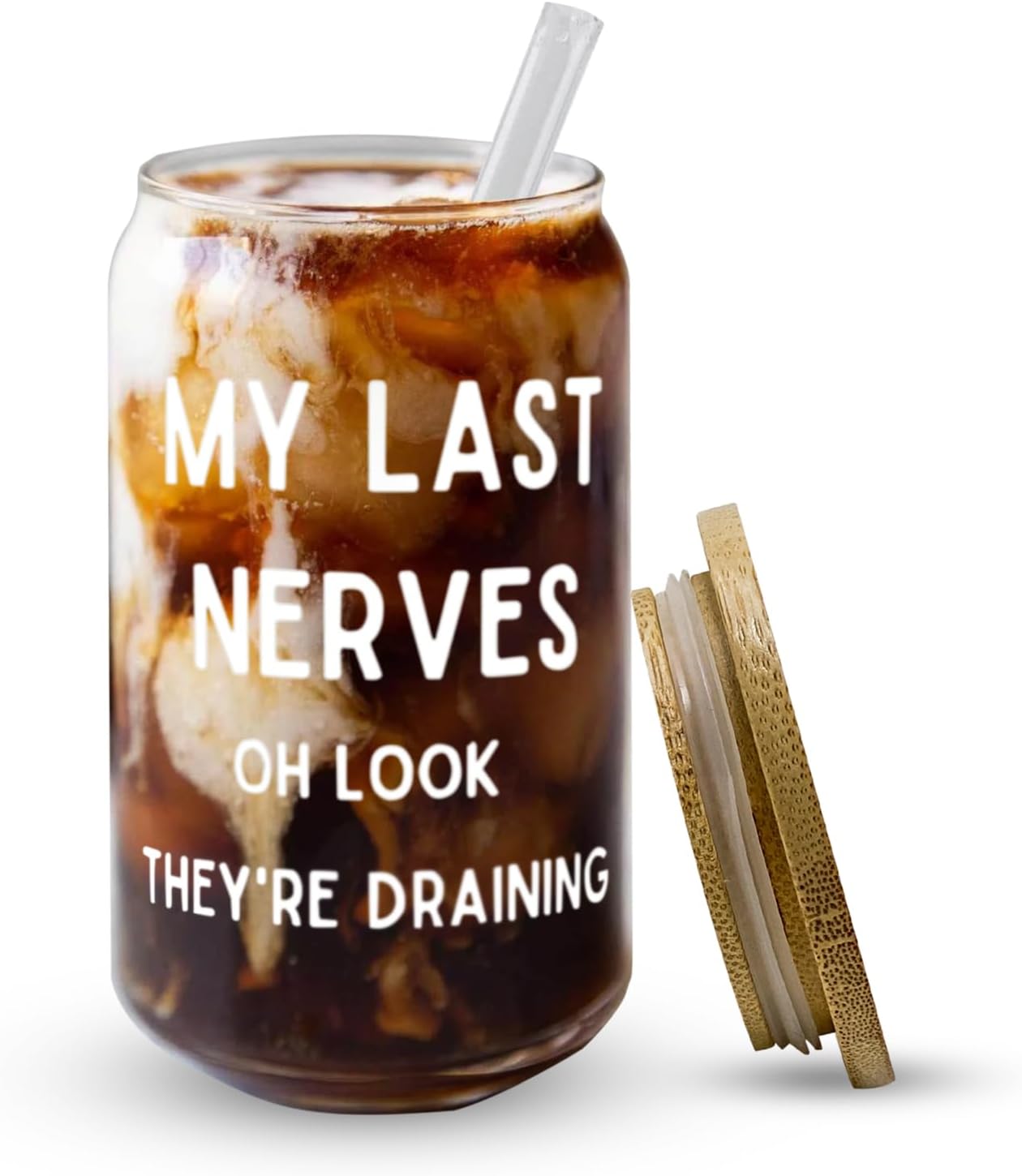 16oz Coffee Drinking Glass With Bamboo Lid – Stylish & Sustainable Drinkware for Smoothies, Iced Coffee, More – Thoughtful Gift Drinking Glass – My Last Nerves, Oh Look they’re Draining