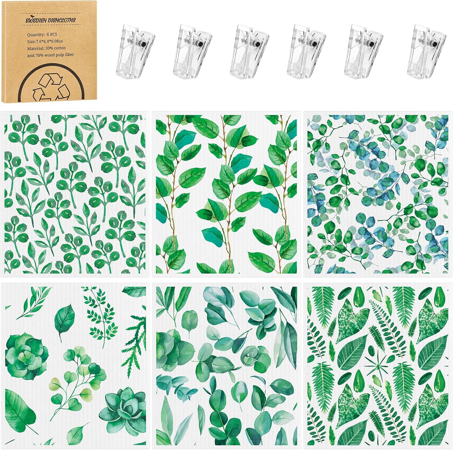 Swedish Dishcloths Set : You will receive a boxed dishcloth set, which includes 6 green leave pattern dishcloths and 6 self-adhesive clips, the size of each dishcloth is 7.5*6.7 in.Can meet your daily cleaning needs and make your cleaning more convenient