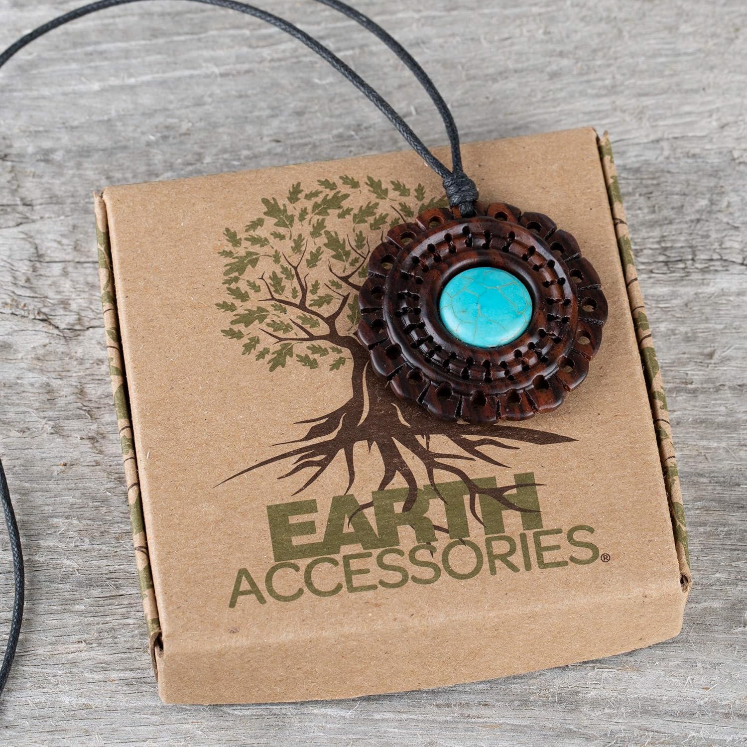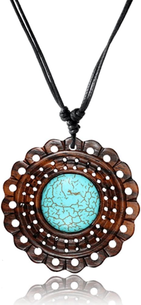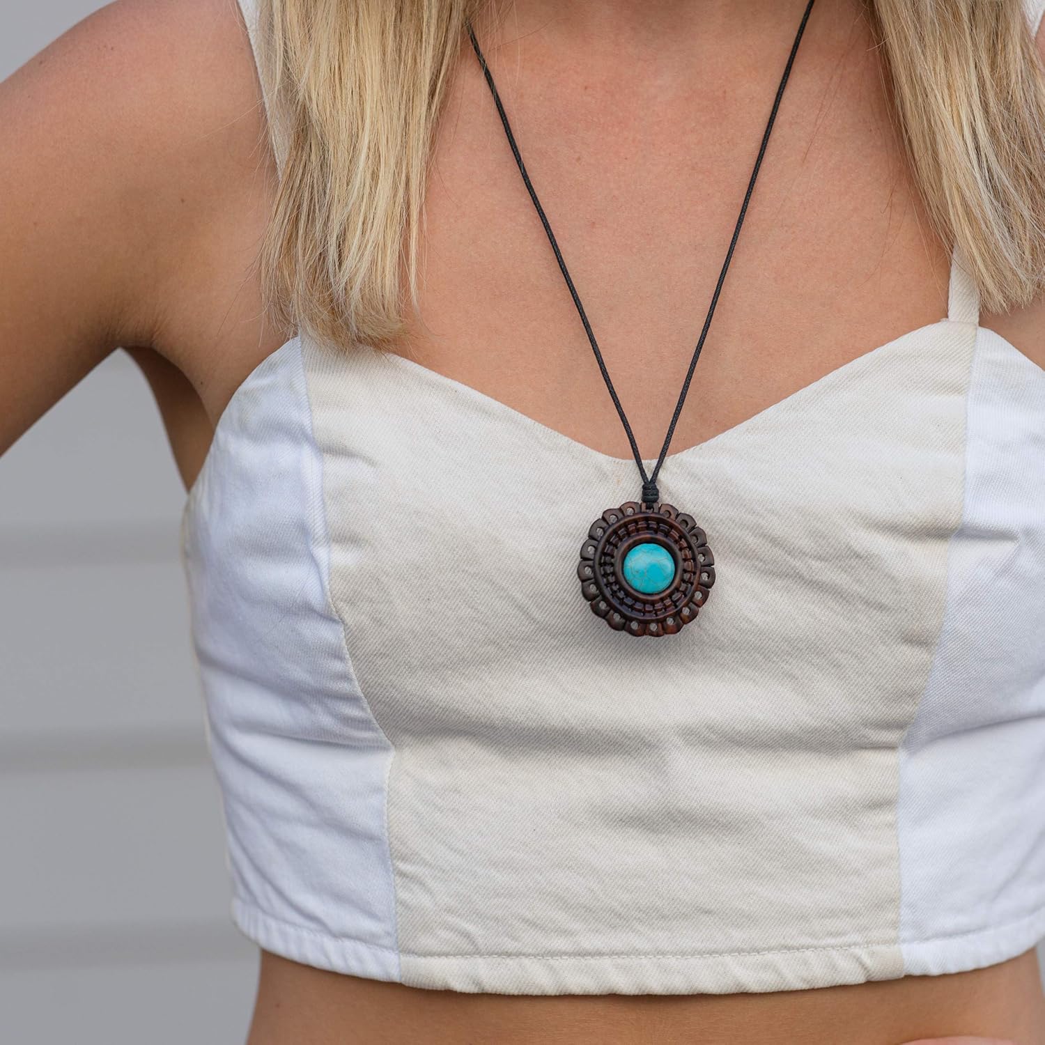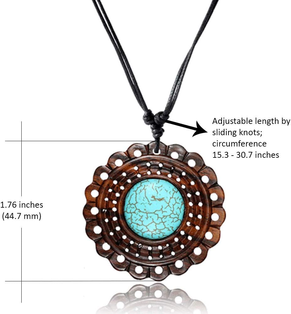 Adjustable Turquoise Necklace with Organic Wood – Mandala Flower of Life Turquoise Jewelry for Women – Western Wooden Pendant Necklace