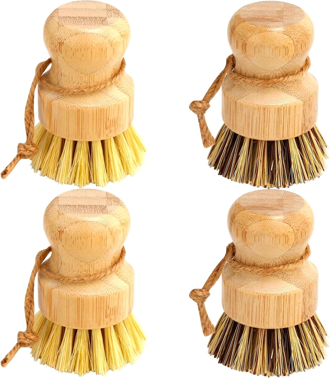 【4PCS Biodegradable Dish Brush】Bamboo dish brush set are truly made from organic bamboo handle, 2 PCS dark brislte brush: bamboo, union fiber (mixed palm fiber and sisal, hard bristle), 2 PCS brown bristle brush: bamboo, sisal (tampico fiber, medium hard) it’s really an eco-friendly and zero waste kitchen brushes.