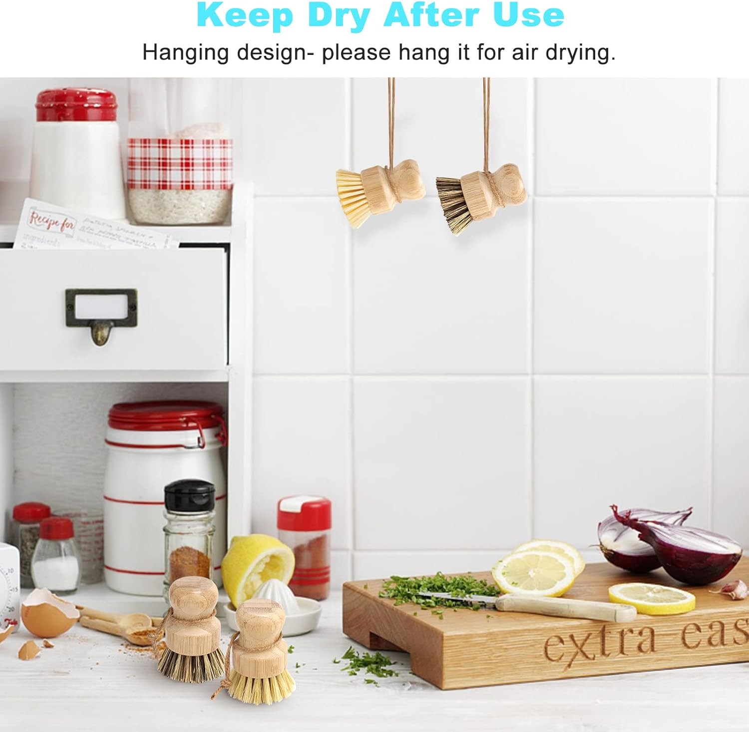 Bamboo is natural plant, like wood, so do not soak it in the water for a long time. Hemp rope-hang it for air drying, wood dishes scrub brush keep dry after use.