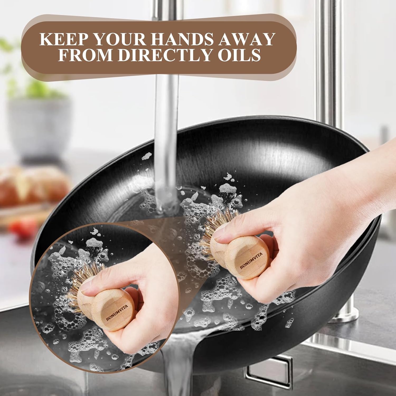 NATURAL MATERIAL: With bamboo handle,the bristles made from a blend of palm fibers and sisal, good for scrubbing grease and grime from kitchen dishes