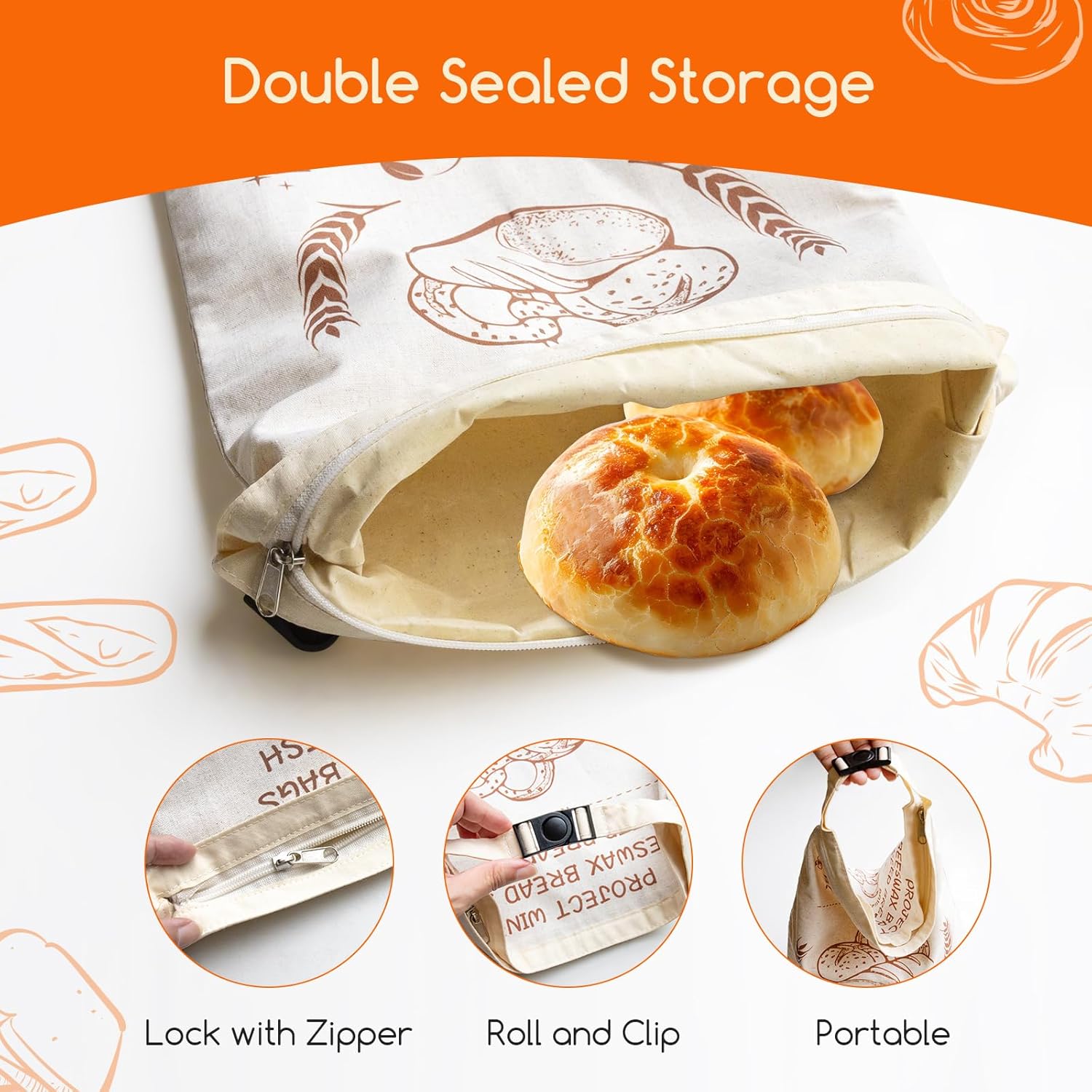 Dual Seal Storage Design: The innovative dual-lock design of our Sourdough Bread Bags features both a zipper and button to keep your bread fresher for longer. The roll-up and clasp design makes them practical and easy to carry, perfect for on-the-go use.