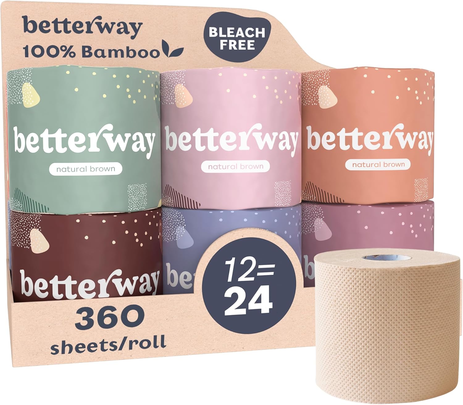 Betterway Unbleached Bamboo Toilet Paper Rolls – Eco-Friendly 3 Ply Toilet Tissue – 12 Long-Lasting Rolls – 360 Sheets/Roll – Organic, FSC Certified, Septic Safe TP – Lint-Free, PFAS-Free Bath Tissue