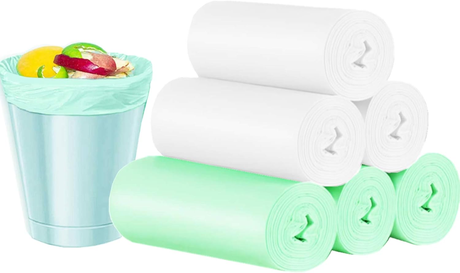 Perfect Fit 4-6 Gallon Rubbish Can Bags: Our compost trash bags large than some kitchen trash bags ,measures of the 4-6 gallon trash bag is 19.6 inches x 23.6 inches ,Each 0.79 mil thick,which means prevents trash can liners from sliding down and more strong tougher, 20 counts of 6 rolls ( 20 count per roll). 3 roll white, 3 roll green