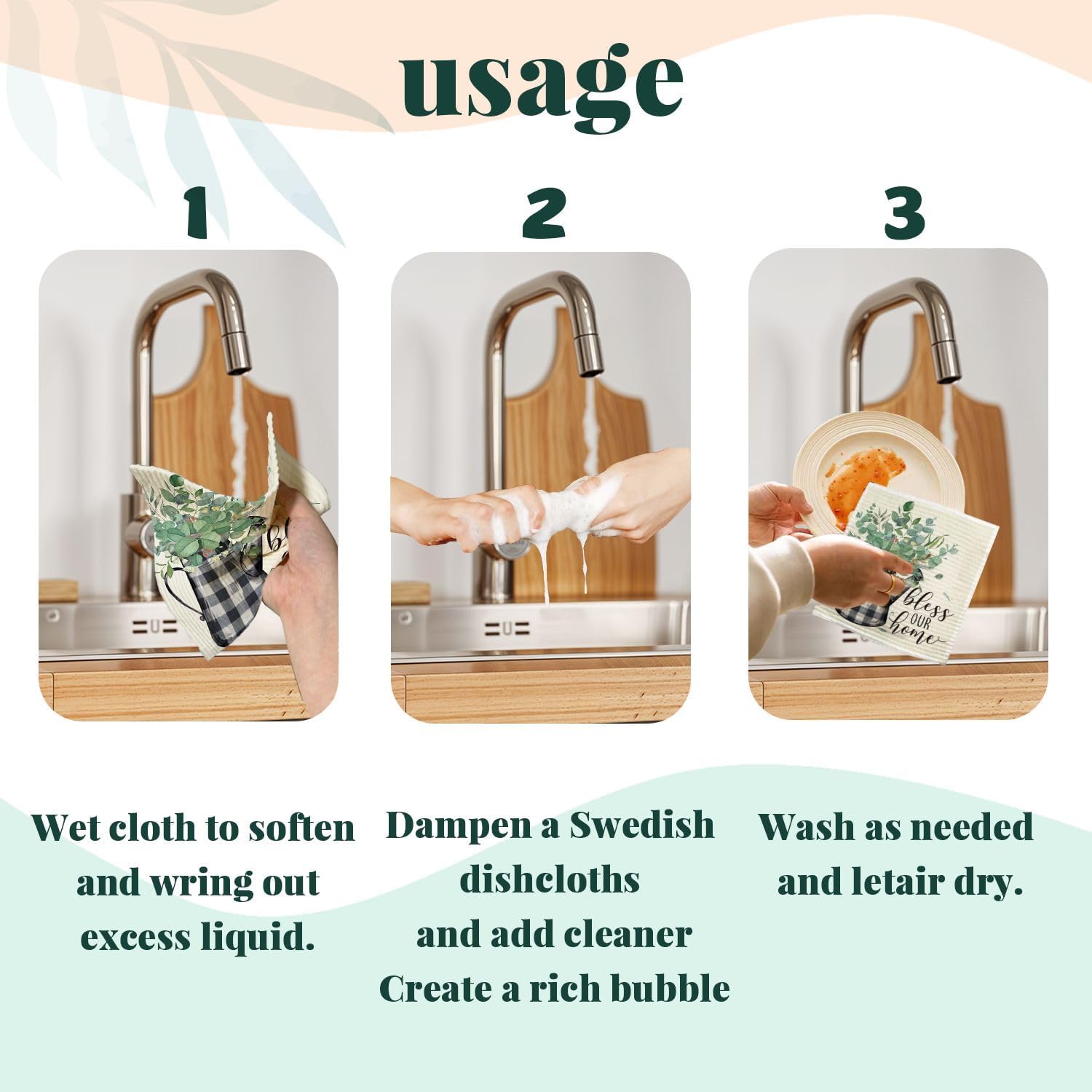 【Usage】: Wet cloth to soften and wring out excess liquid.Dampen a Swedish dishcloths and add cleaner Create a rich bubble,Wash as needed and letair dry.