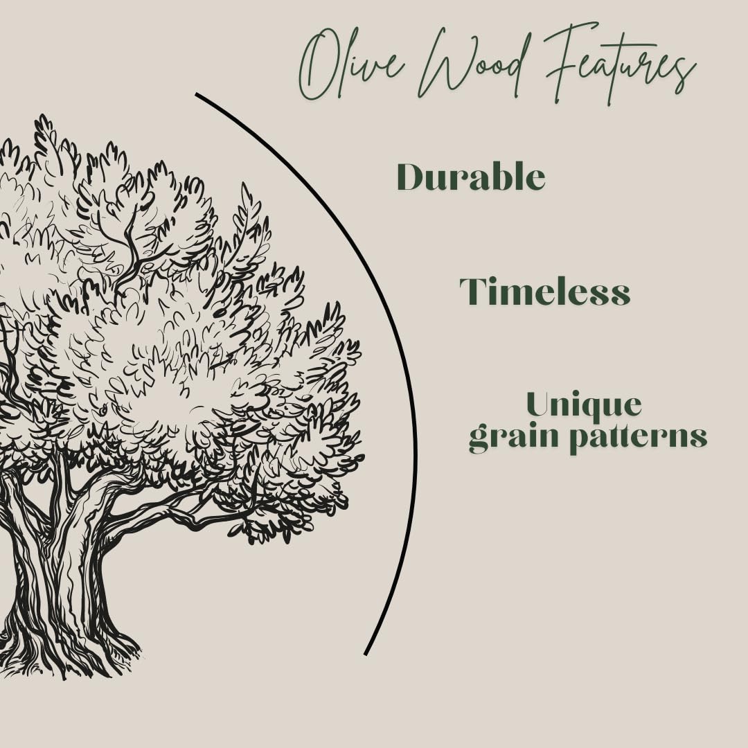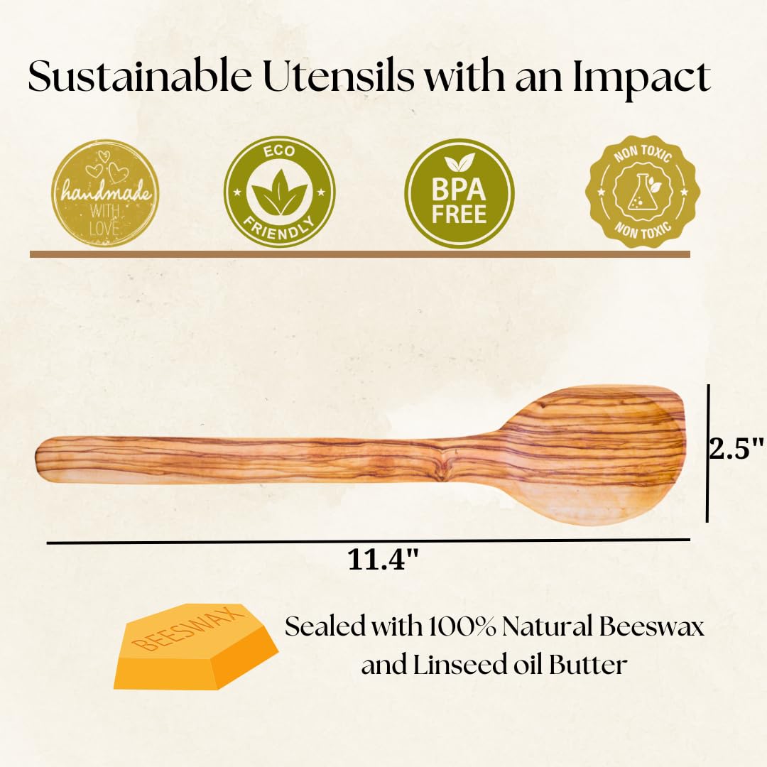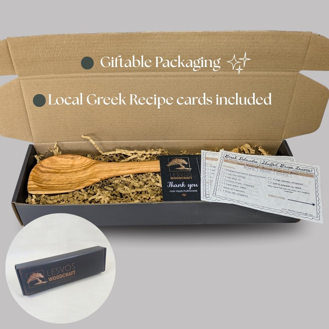 SUSTAINABLY SOURCED OLIVE WOOD: Made from 100% natural, eco-friendly olive wood from Lesvos, Greece, known for its durability, stain resistance, and beautiful grain, this olive wood kitchen utensil is free from dyes and chemicals, making it an ideal choice for wooden cooking utensils and wooden serving spoons. Each piece showcases the unique qualities of sustainable olive wood, ensuring a one-of-a-kind addition to your kitchen tools collection.