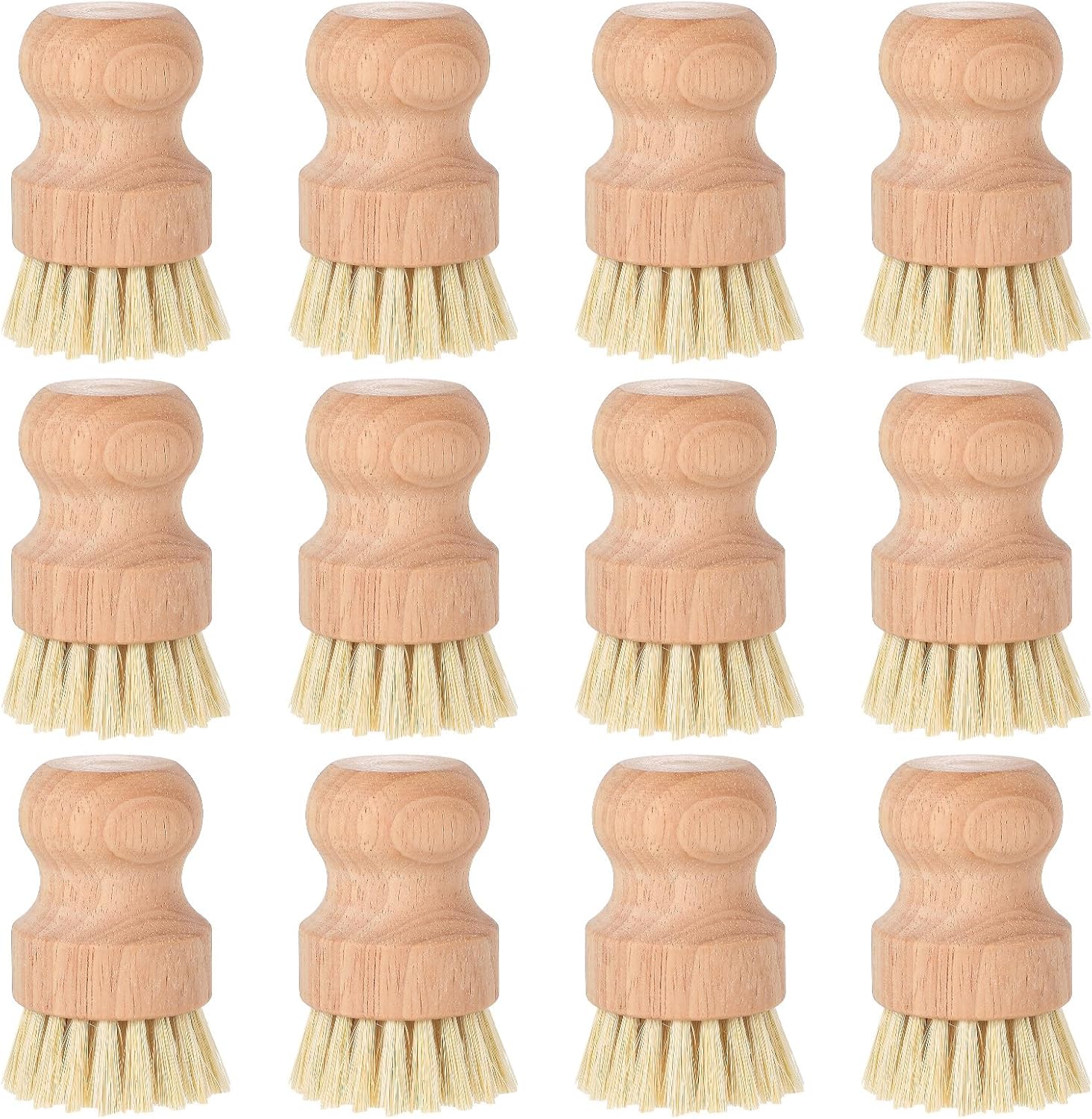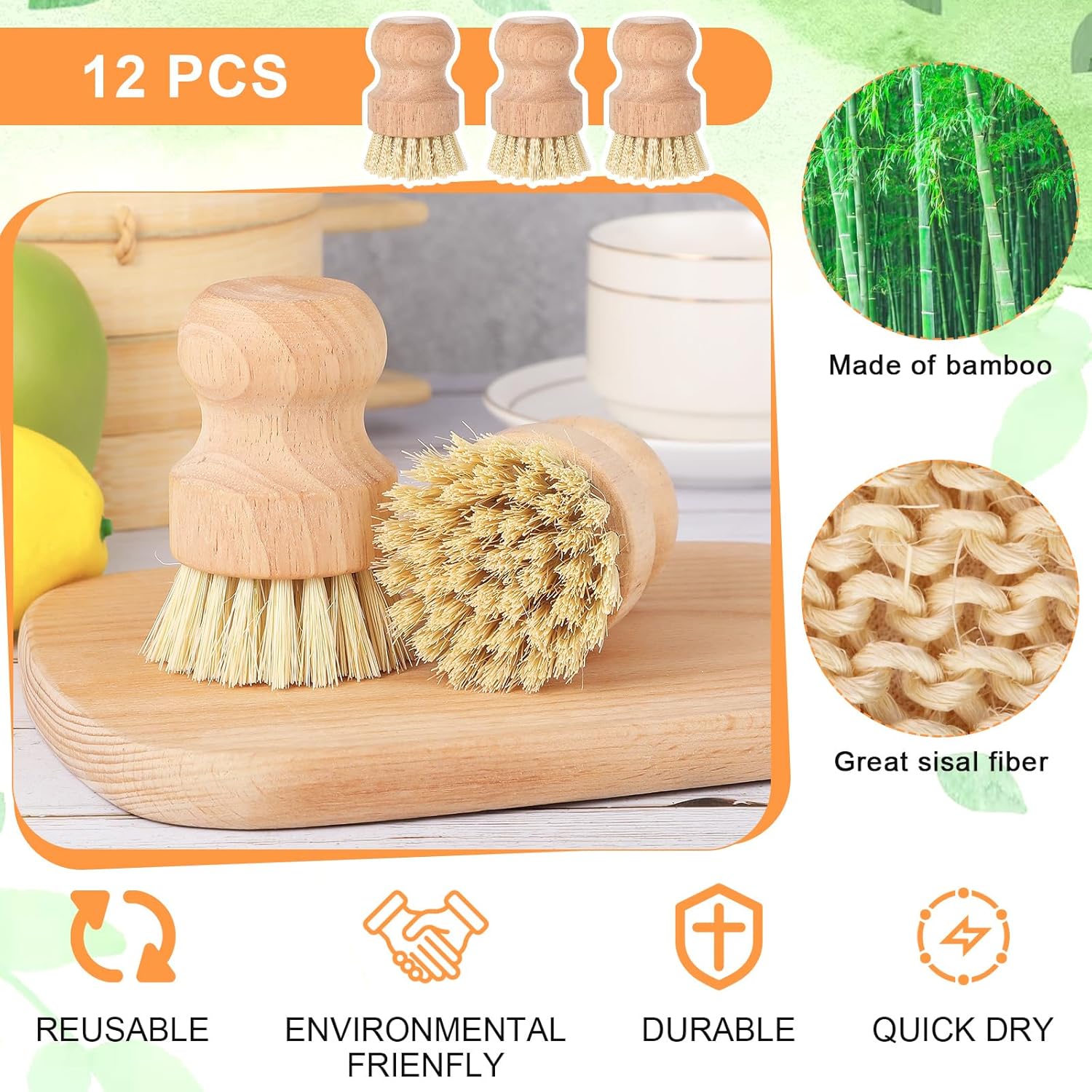 cobee 12Pcs Bamboo Dish Scrub Brushes, Kitchen Dishwashing Scrubber with Natural Sisal Bristles Round Wooden Dish Scrubber Brush for Iron Pot Pan Food Kitchen Sink Fruit Vegetable Wash