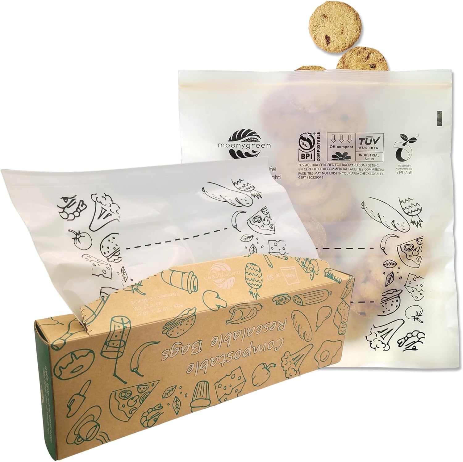 🌱 Moonygreen Resealable Food Storage bags have acquired the highest-rated ASTM D6400, European standard EN 13432 and BPI certified, proving that the bags are compostable with industrial facilities.
