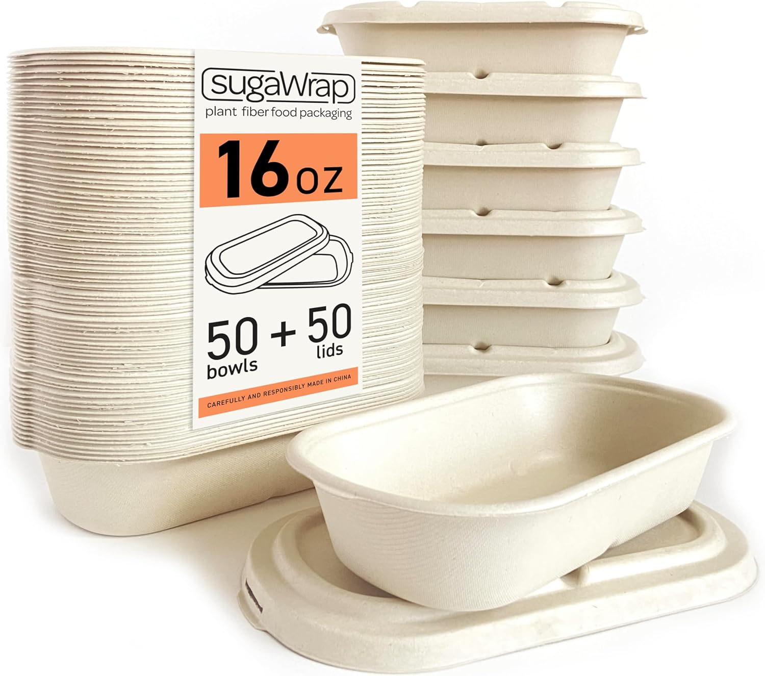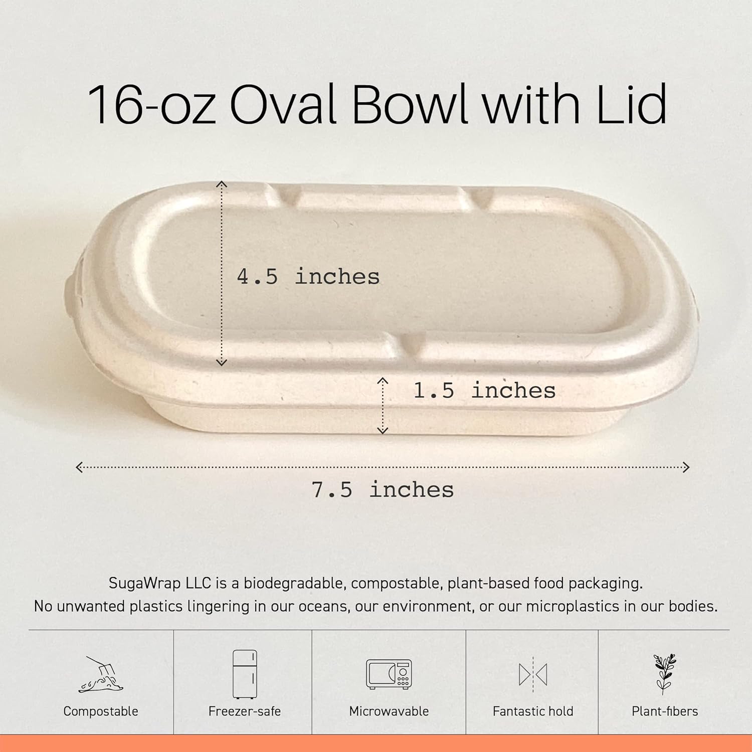 Disposable 16oz Oval Food Containers with Lids [50 Bowls + 50 Lids] Eco-Friendly Biodegradable Bamboo & Sugarcane, Sturdy, Freezer & Microwave Safe for Hot & Cold