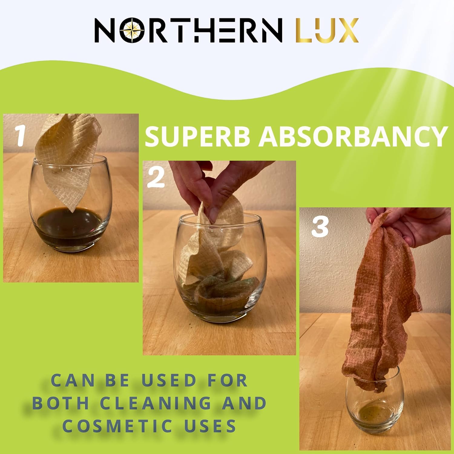 🌱 SUPER STRONG – When stretched, our towels resist tearing due to the strong properties of interwoven bamboo fibers; even when they are wet! Our towels do not “pill” or have lint compared to other options. Once wet, you can feel confident that it won’t tear while you’re making multiple uses. Traditional cotton pads for face will often tear. Northern Lux towels will still hold their form.