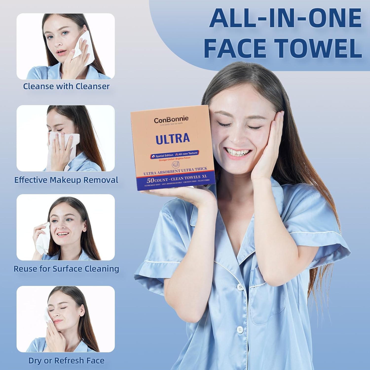 Disposable Face Towel XL, Special Ed., 10″×12″ Bio-based Facial Towels, Extra Thick Soft Large Face Towelettes, Makeup Remover Dry Wipes for All Skin Types, Facial Tissue, 50 Ct. (1 Pack)