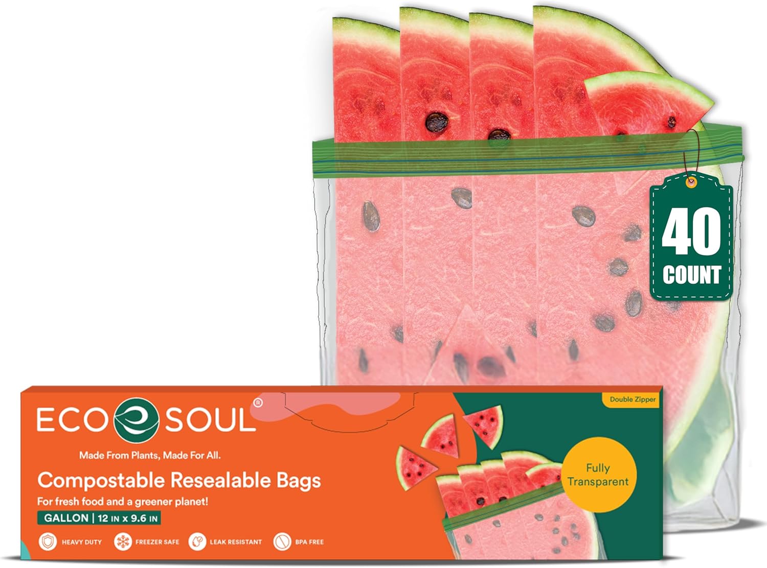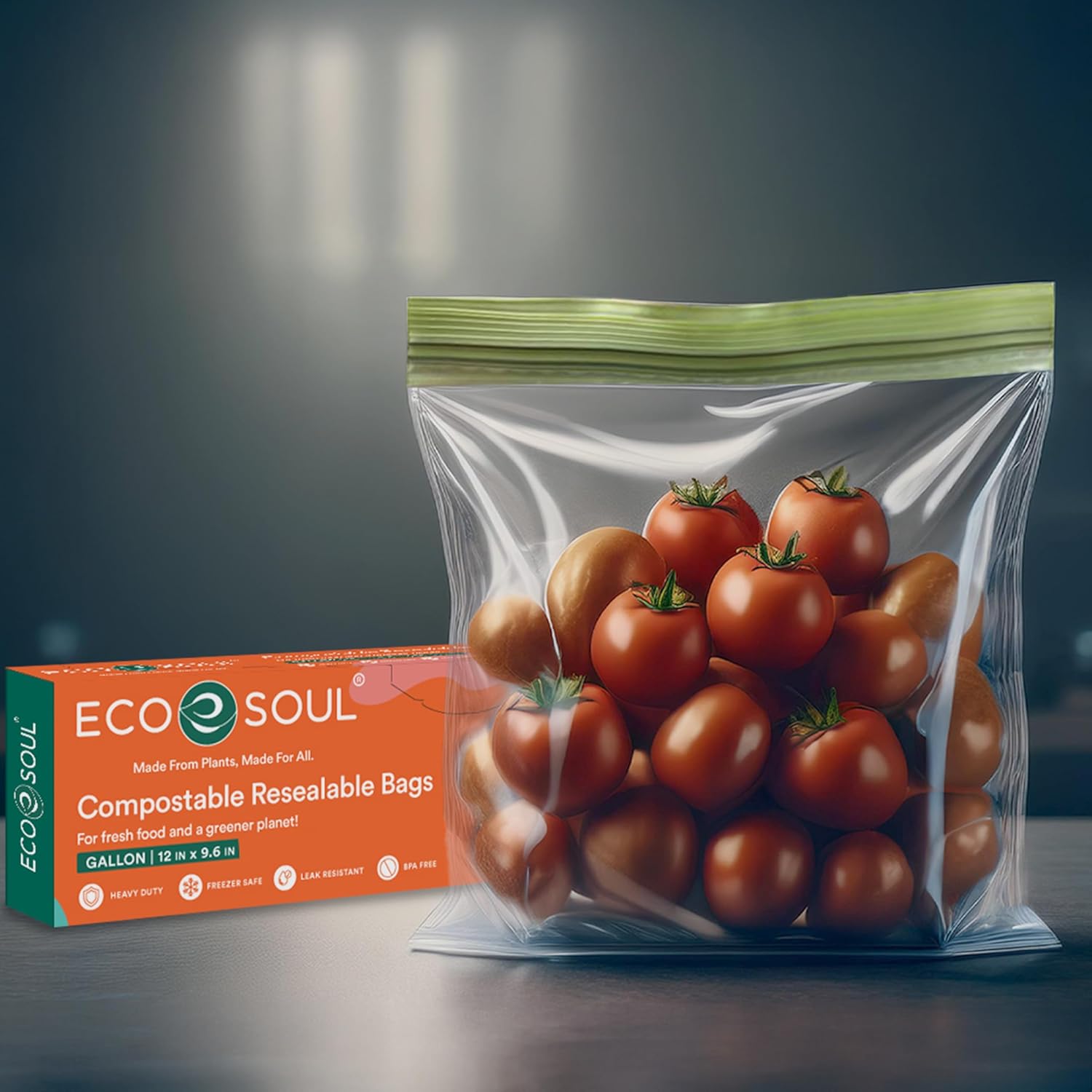 ECO SOUL 100% Compostable Gallon Bags [40 Counts][11.5″x10.6″] Resealable Bags, Freezer, Eco-friendly Zip, Leakproof, Biodegradable for Food