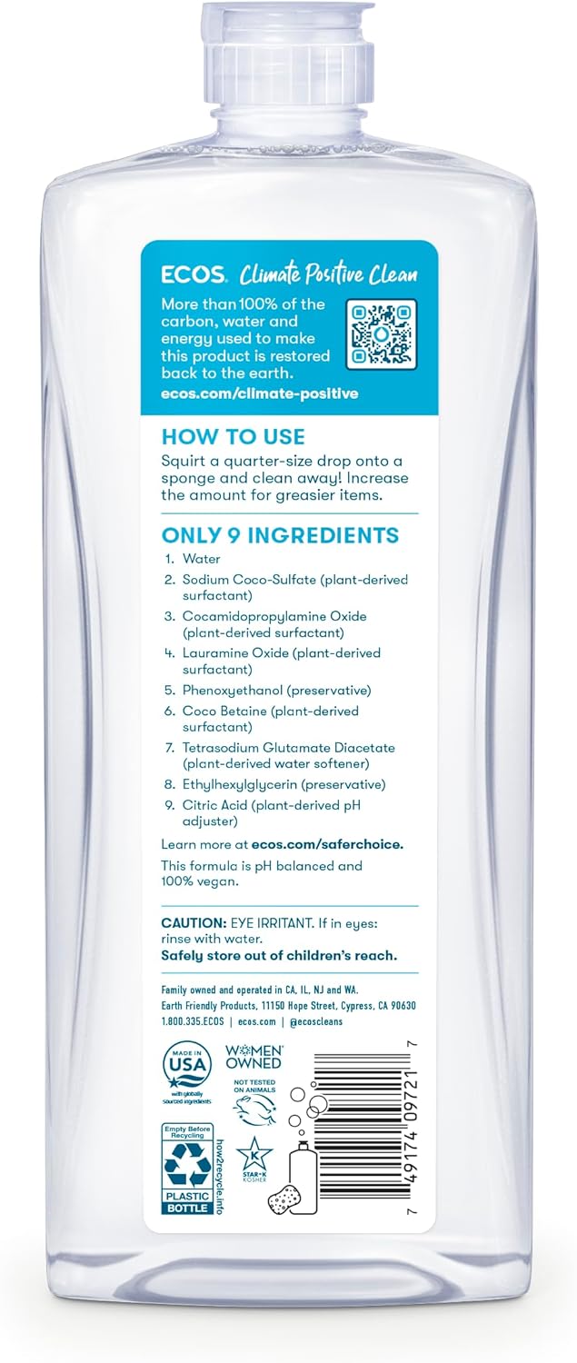 Sparkling clean dishes come from a sparkling clean ingredient list. Tough on grease and food residue yet gentle enough to use on delicate items like baby bottles, this formula is packed with efficacious plant-powered cleaners (like those found in coconuts!). Our liquid dish soap formula is vegan and hypoallergenic and contains no dyes, 1,4-dioxane, parabens, or phosphates, so you can be confident that you’re using a product that is a safer choice for the whole family and the planet. With no harsh chemicals to dry out your hands, you can wash worry-free. ECOS Dish Soap is more than just effective at cleaning dishes; it is a true sustainable solution. Since 1967, ECOS has created safer, powerful products by using enzymes found in nature. ECOS Dish Soap is made in a carbon neutral, water neutral, TRUE Platinum Zero Waste factory using 100% renewable energy.
