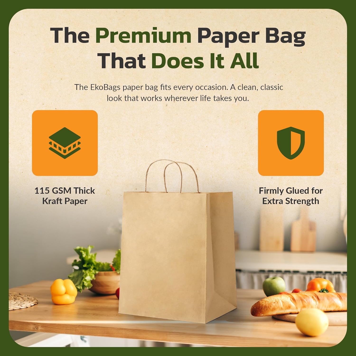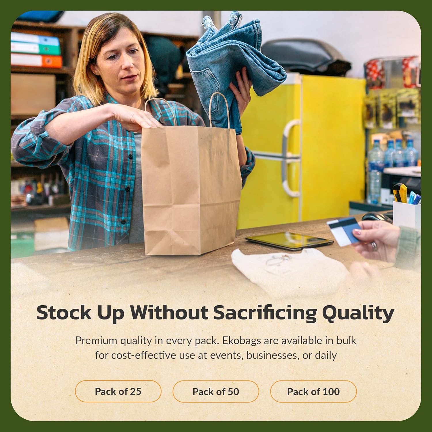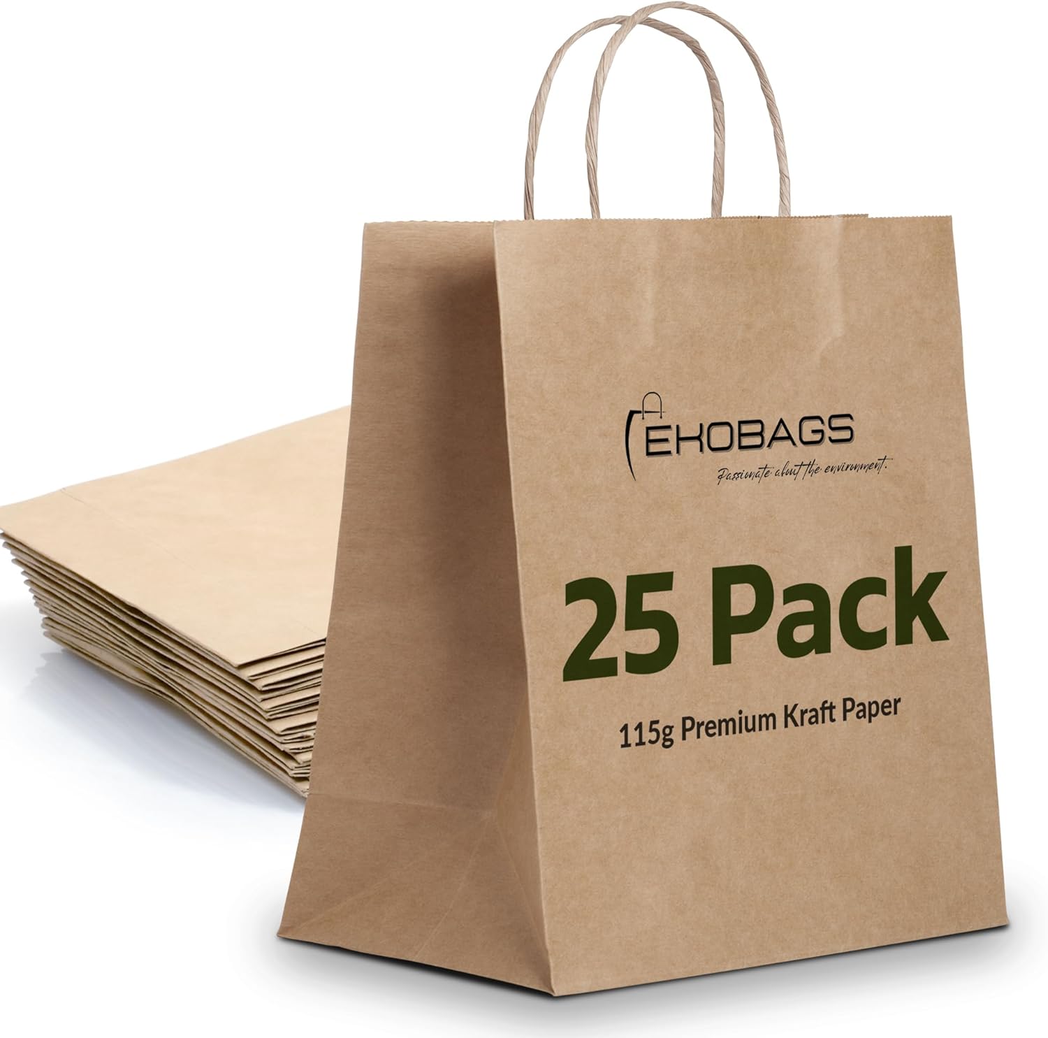 EKOBAGS Granvia Kraft Paper Gift Bags with Handles (1 Count, 25-Pack) | 115 GSM Brown Paper Bags for Small Business, Shopping, & Party Favors | Recyclable | Holds up to 13.8L/8 lbs | 10x7x12 inches