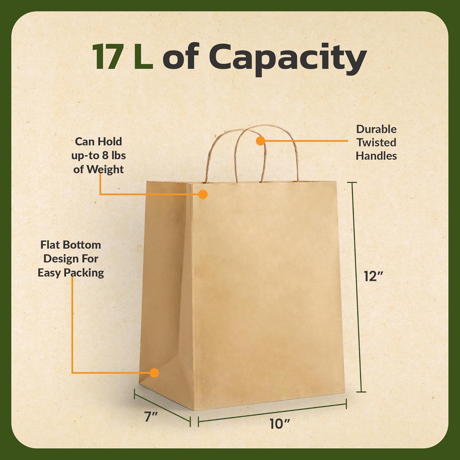Versatile 25-Pack Kraft Paper Gift Bags: Our paper bags with handles (10x7x12 in) hold up to 13.8L/8 lbs. Use as shopping bags, to go bags, or thank you gift bags for holiday gifts and events. Stock up on paper bags for business or personal use.