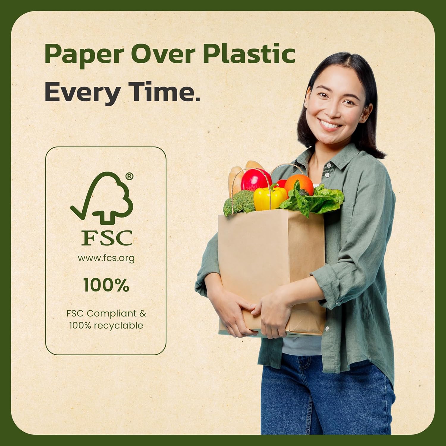Responsibly Sourced: Crafted from recycled paper from FSC-compliant and responsibly managed forests. These brown paper bags are recyclable where facilities are available. Make an easy switch from single-use plastic with these kraft bags with handles.