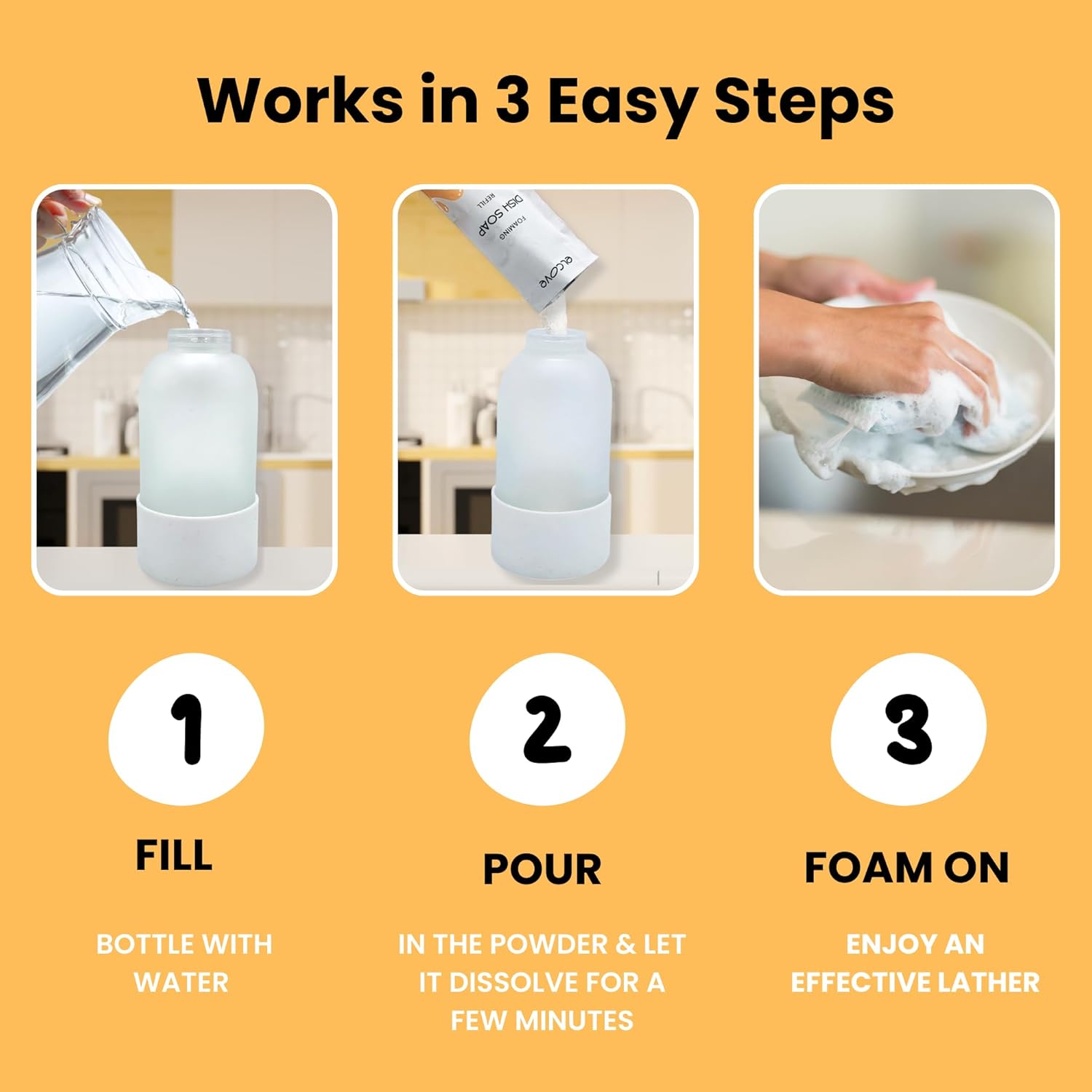 EASY TO REFILL. Save yourself from buying gallons after gallons of dish washing liquids again. Easily refill your dishsoap at home. Simply mix the powder refill with water in any 12oz -16oz reusable foaming soap bottle or foaming spray bottle to create a powerful, zero waste dish soap that is gentle on your skin and tough on grease.
