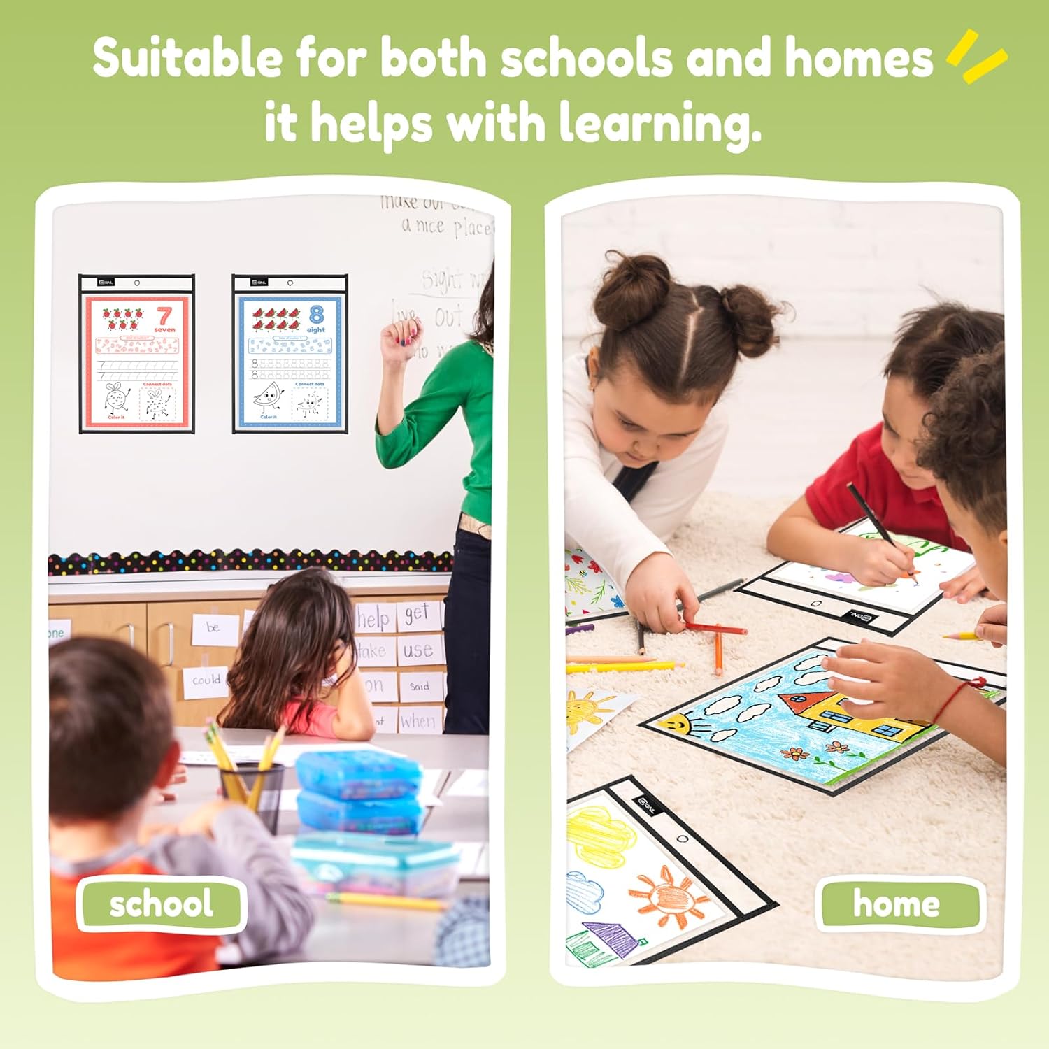 Durable & Reusable: Made of durable plastic and double stitched reinforcement around the edges of each pocket, able to withstand frequent use by kids and stand up to long-term wear and tear, reusable, allows students to utilize paper worksheets multiple times without wasting paper