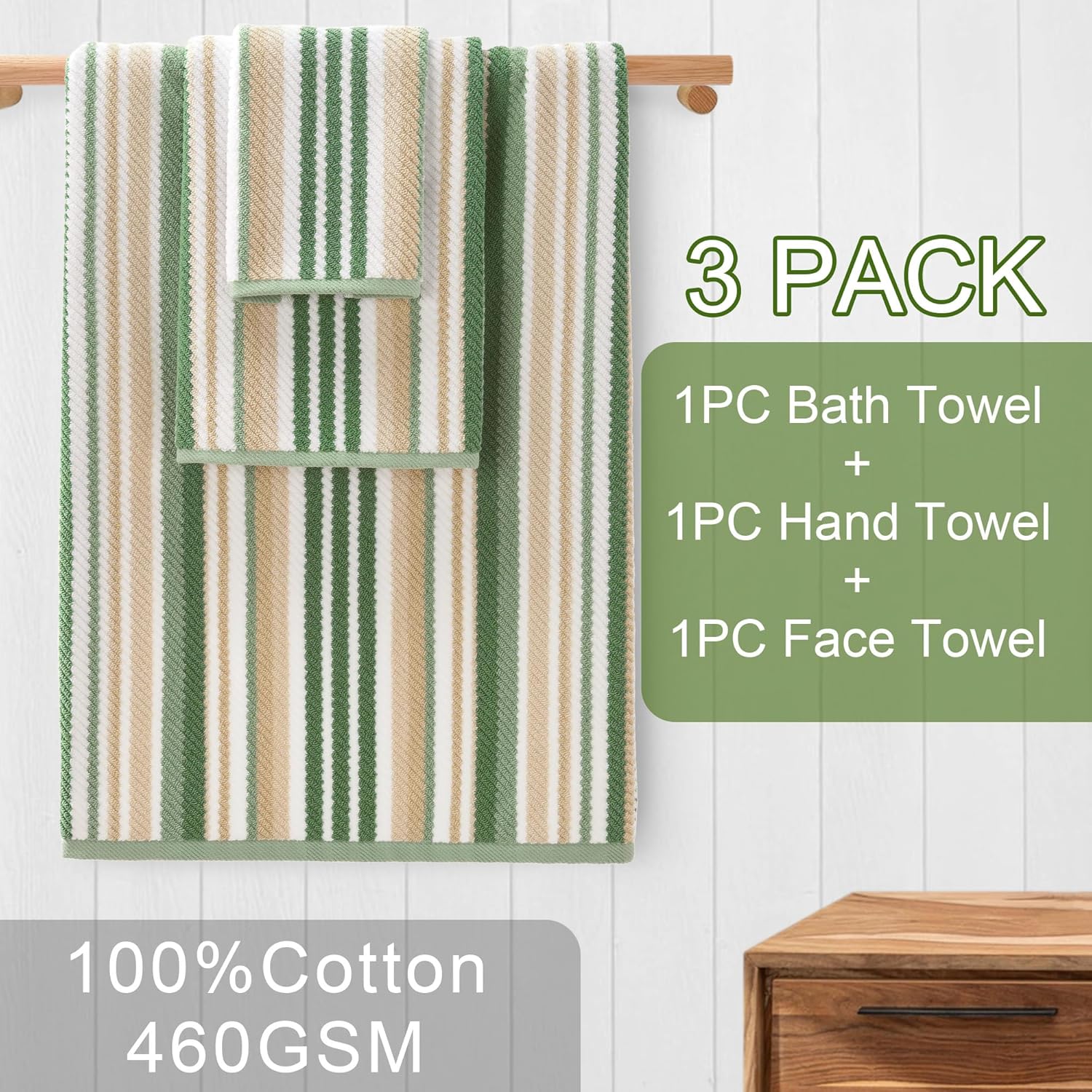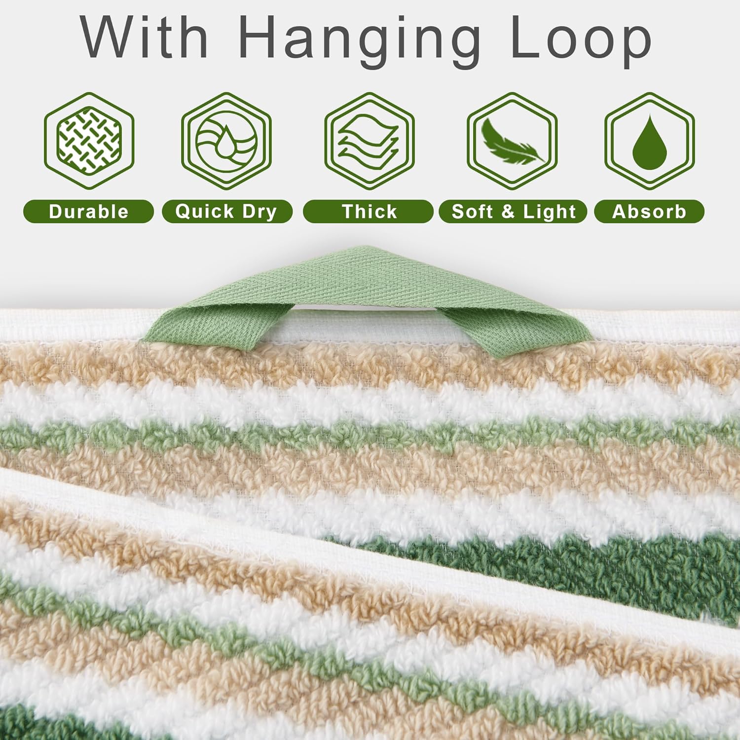 Green Striped Towels – 100% Cotton, Quick Dry, Soft & Absorbent, 3PC Luxury Towels Set (Bath 28″x52″, Hand 16″x27″, Wash Cloth 13″x13″), Stripe Shower Towel with Hanging Loop, Sage and Beige