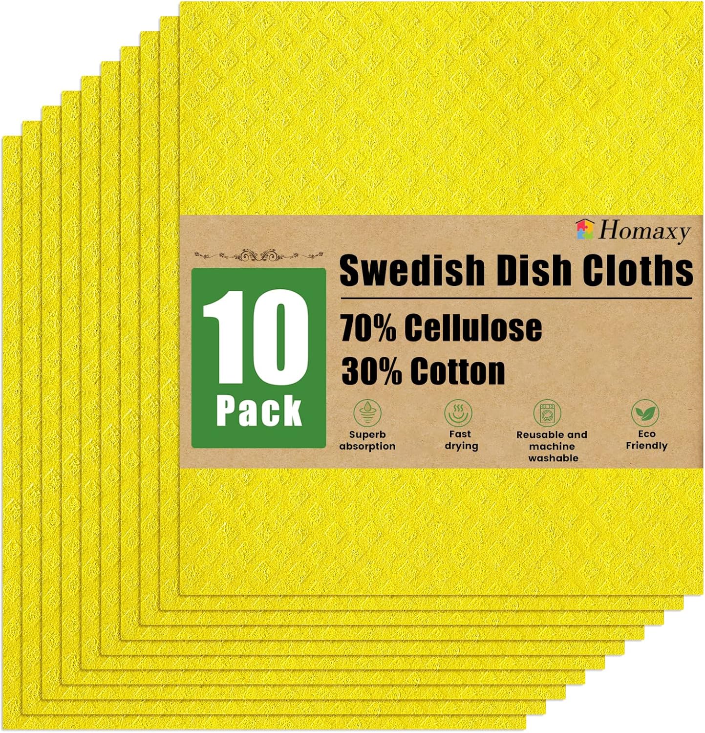Homaxy Swedish Dishcloths for Kitchen, 10 Pack Reusable and Washable Cellulose Sponge Cloths Dish Towels, Absorbent and No Odor Paper Towels for Dishes & Counters, Yellow