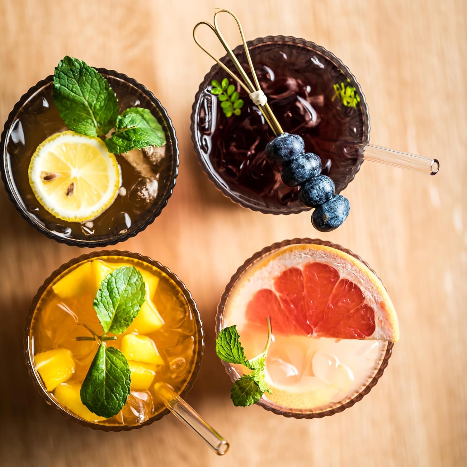 KEMORELA 4-Pack Ribbed Drinking Glasses, 16 oz Vintage Highball Cups with Glass Straws, Old Fashioned Glasses, Elegant Tumblers for Water, Juice, Whiskey – Perfect for Iced Coffee and Cocktails