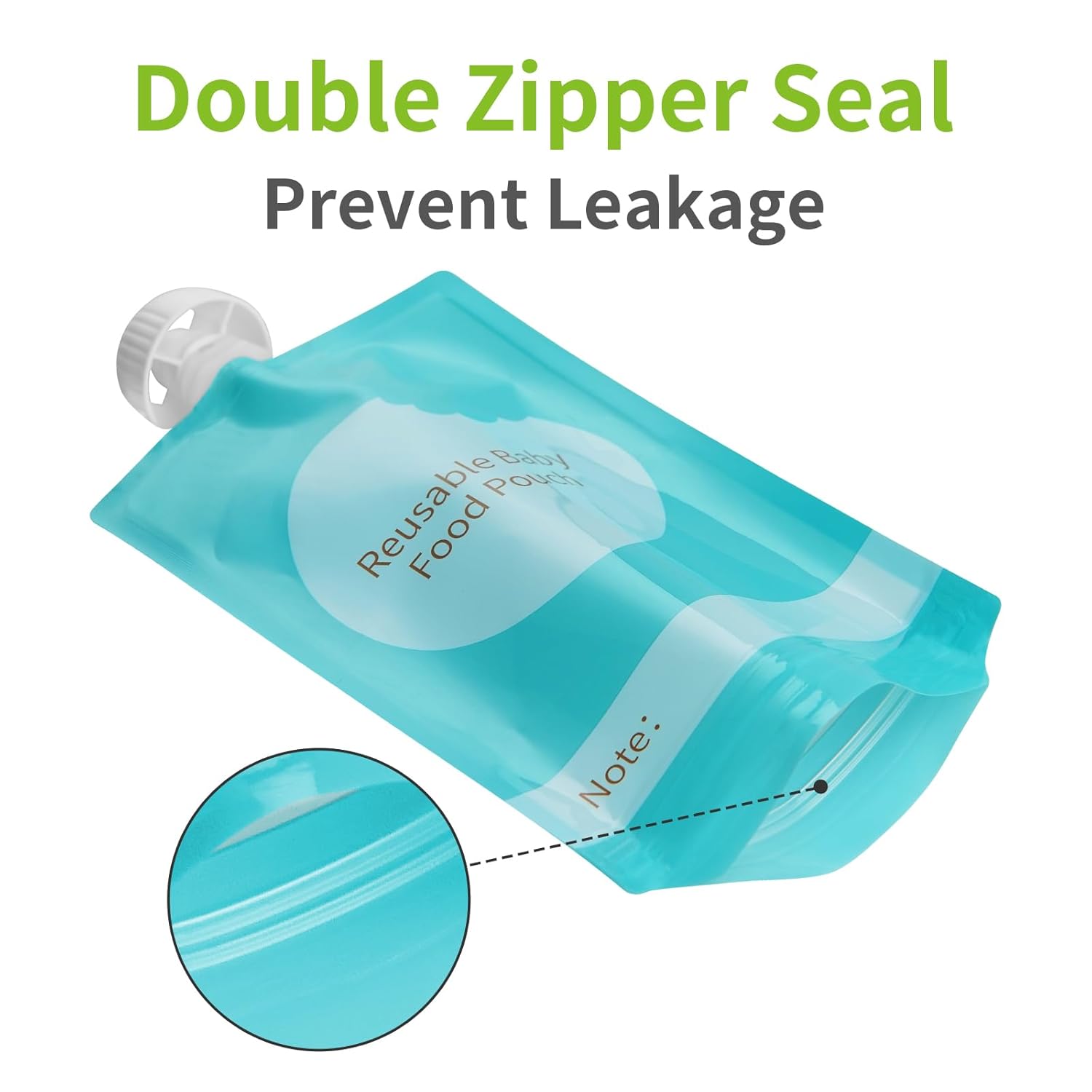 The double zipper of our baby food pouches prevents leakage and mess, and the big bottom opening design allows the pouch to be fully opened for air drying. There are no corners or cracks for food to get stuck.