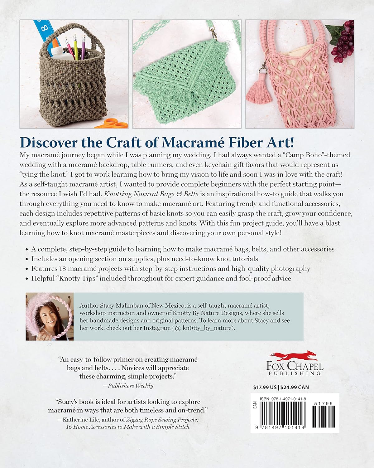 18 step-by-step projects for bohemian-inspired macramé belts, bags, and purses that are on-trend, yet timeless, and won’t go out of styleUse natural materials that are better for the earth like cotton, jute, and twine and say goodbye to wasteful fast fashionBeginner-friendly guide offers clear instructions and photos for each accessory, suggestions for supplies, and need-to-know knot tutorialsHelpful advice called “Knotty Tips” can be found throughout for expert, fool-proof guidance every step of the wayAuthor Stacy Malimban is a self-taught macramé artist and owner of Knotty By Nature Designs where she sells her handmade designs and original patterns, and offers workshops