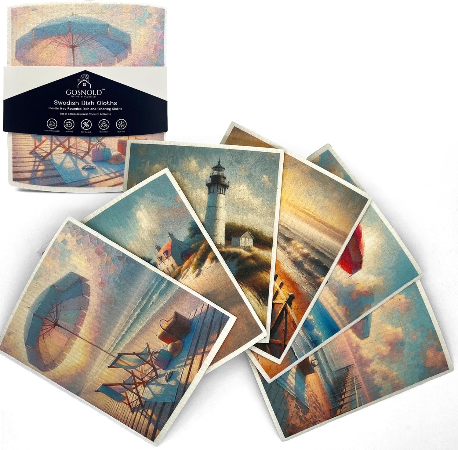 Large 6-Pack Swedish Dishcloths – Reusable, Compostable Sponge Cloths | Eco-Friendly, Absorbent Cellulose Towels | Non-Scratch, Washable Paper Towel Alternative with Coastal Pattern (Impressionism)