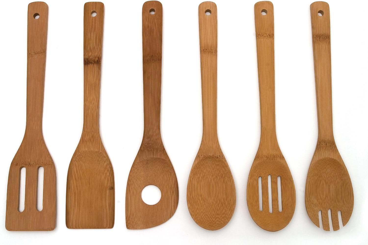 Lipper International provides exceptionally valued items for the kitchen, home, office, and child’s playroom. Known for their functionality and beauty, each of our products is individually crafted from the finest quality materials. This set of 6 Bamboo Wood Kitchen Tools come in a mesh bag with tag. Each mesh bag contains one of each of the following: Slotted Spatula, Spatula, Pointy Spoon, Spoon, and Slotted Spoon. The bamboo wood construction is naturally colored – not stained. Hand wash with a mild soap and cool water. Do not soak. Do not put in the dishwasher, microwave or refrigerator. Extreme changes in temperature will cause the material to crack over time. Dry thoroughly. Occasional use of mineral oil on the inside will help maintain its appearance.