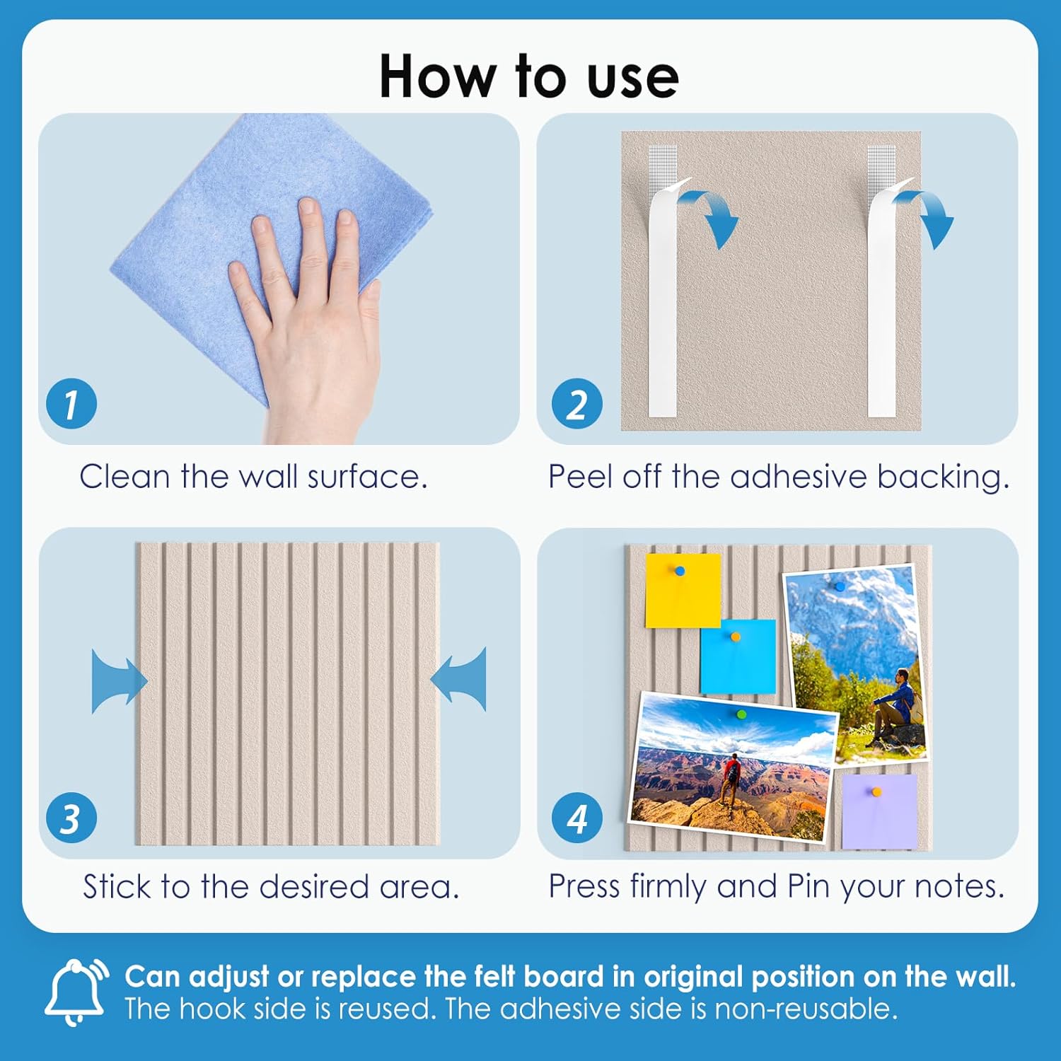 Easy Installation & Strong Adhesive Bonding: Package contains 12 pieces of high-density felt panels, 24 pieces of removable adhesive tapes, and 40 push pins. Each panel measures 11.8″ x 11.8″, 0.35″ thick. The double-sided adhesive tapes have strong adhesion to hold the panels from falling off from walls, meanwhile they can be safely removed without leaving unsightly marks or causing damage to your wall.