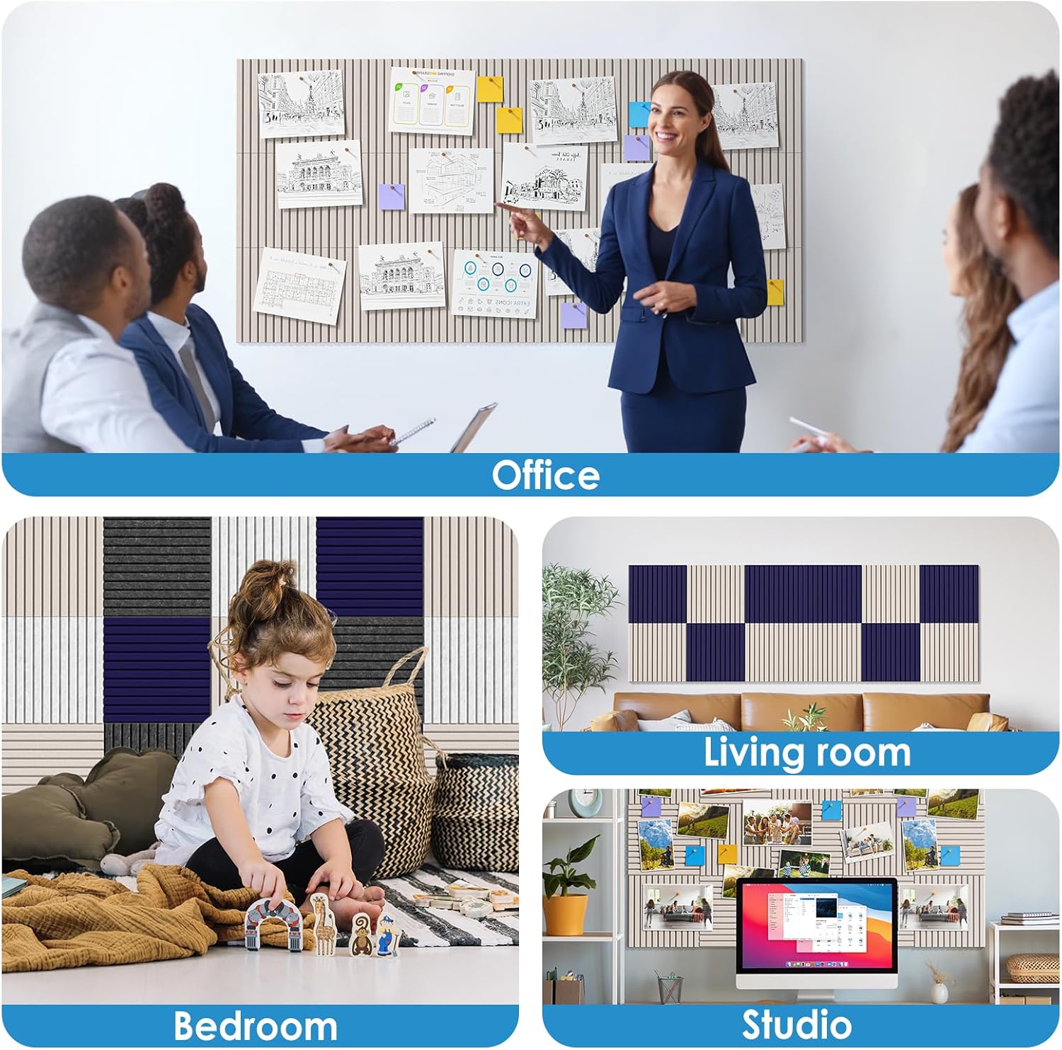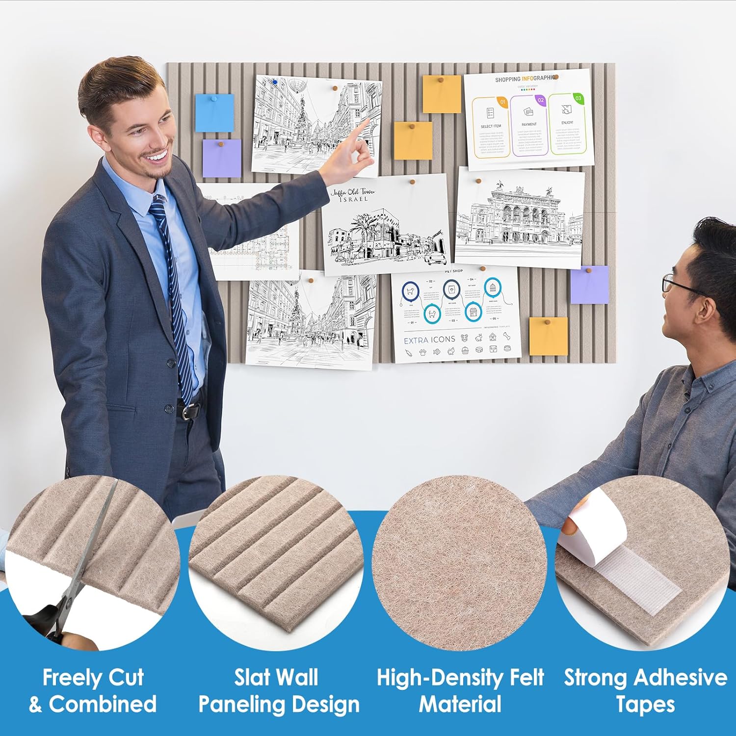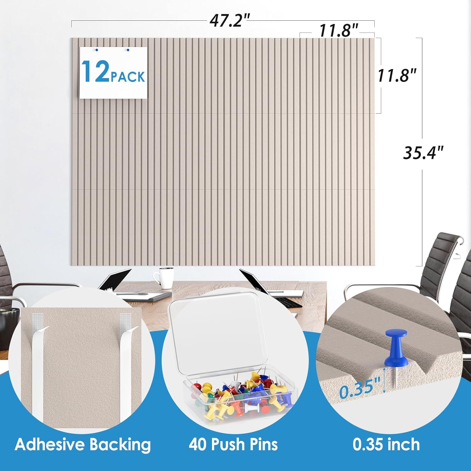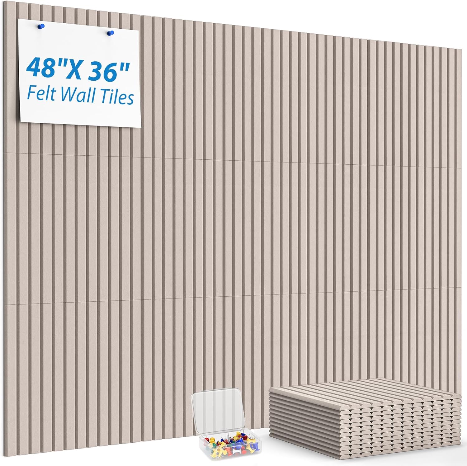 MaxGear Cork Boards for Walls 48″ x 36″, 12 Pack Beige Felt Wall Tiles Bulletin Boards with Slat Paneling, 3D Panels Push Pin Board for Office Wall Decor