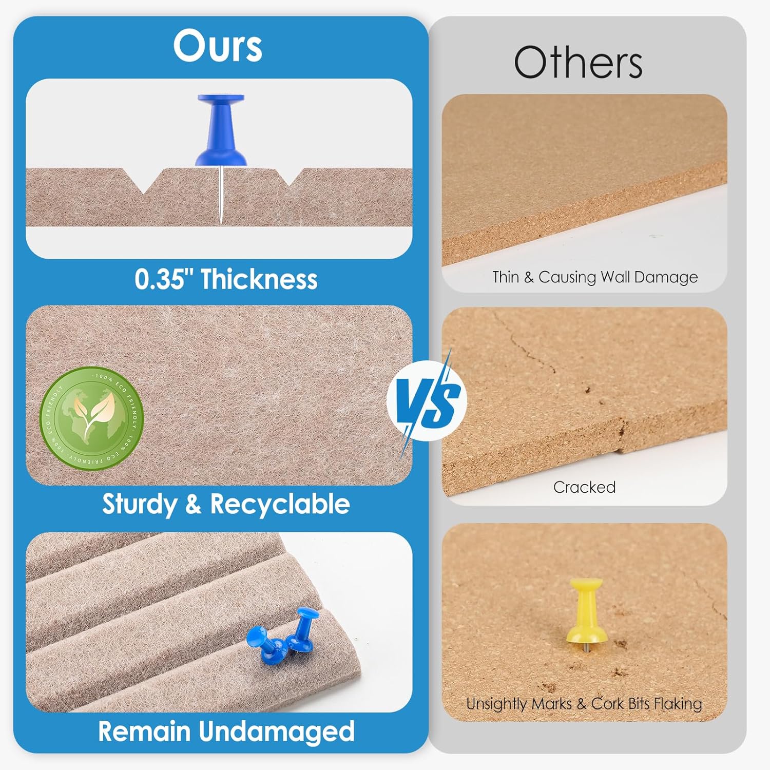 High-Density & Safe Felt Wall Tiles: This felt bulletin board is made from 100% recycled polyester that is odorless, sustainable, and recyclable. The sturdy and safe material is built to withstand daily wear and tear with added flame retardancy. Besides, the push pin board are lightweight yet dense enough to securely hold push pins without going through boards & damaging walls.