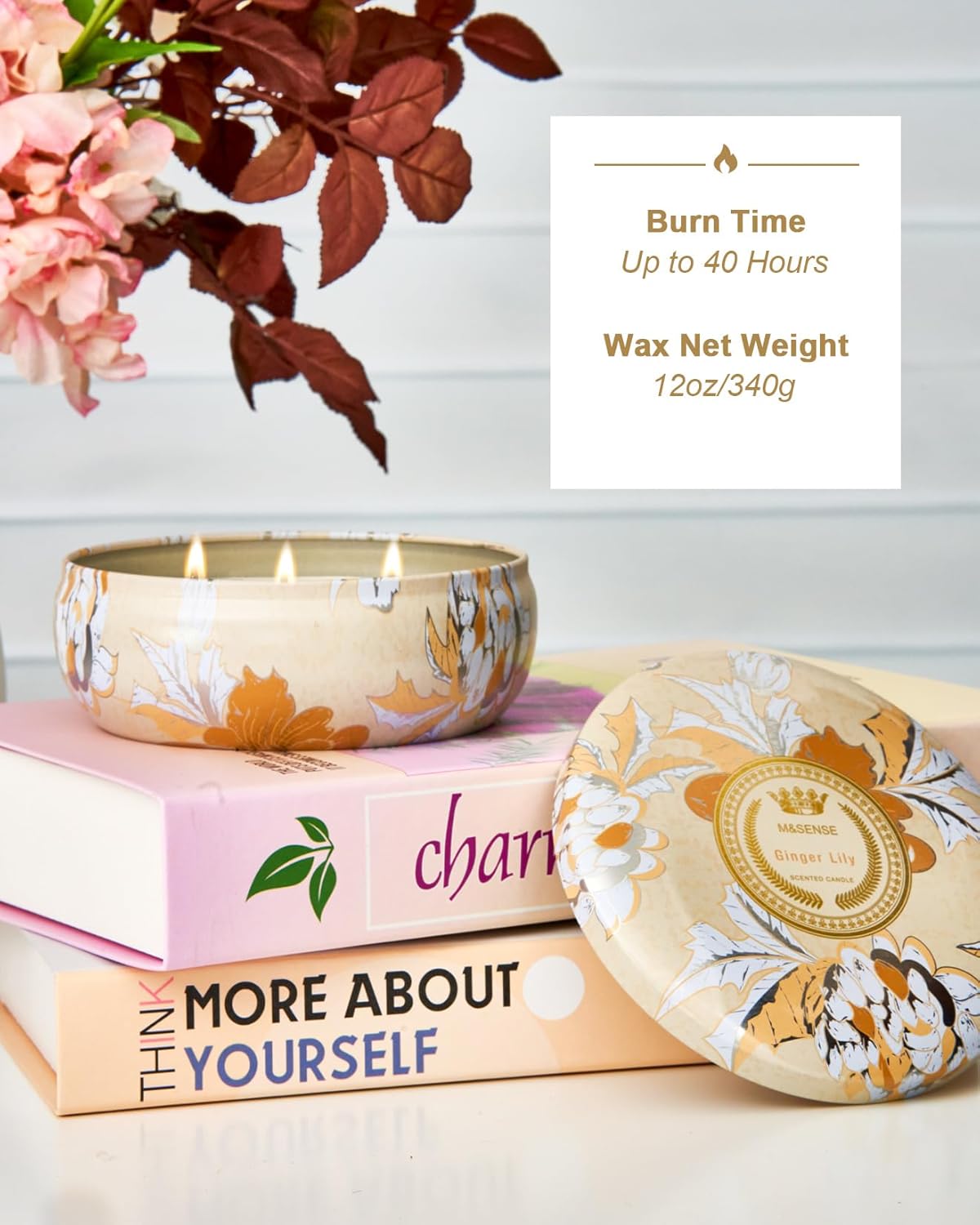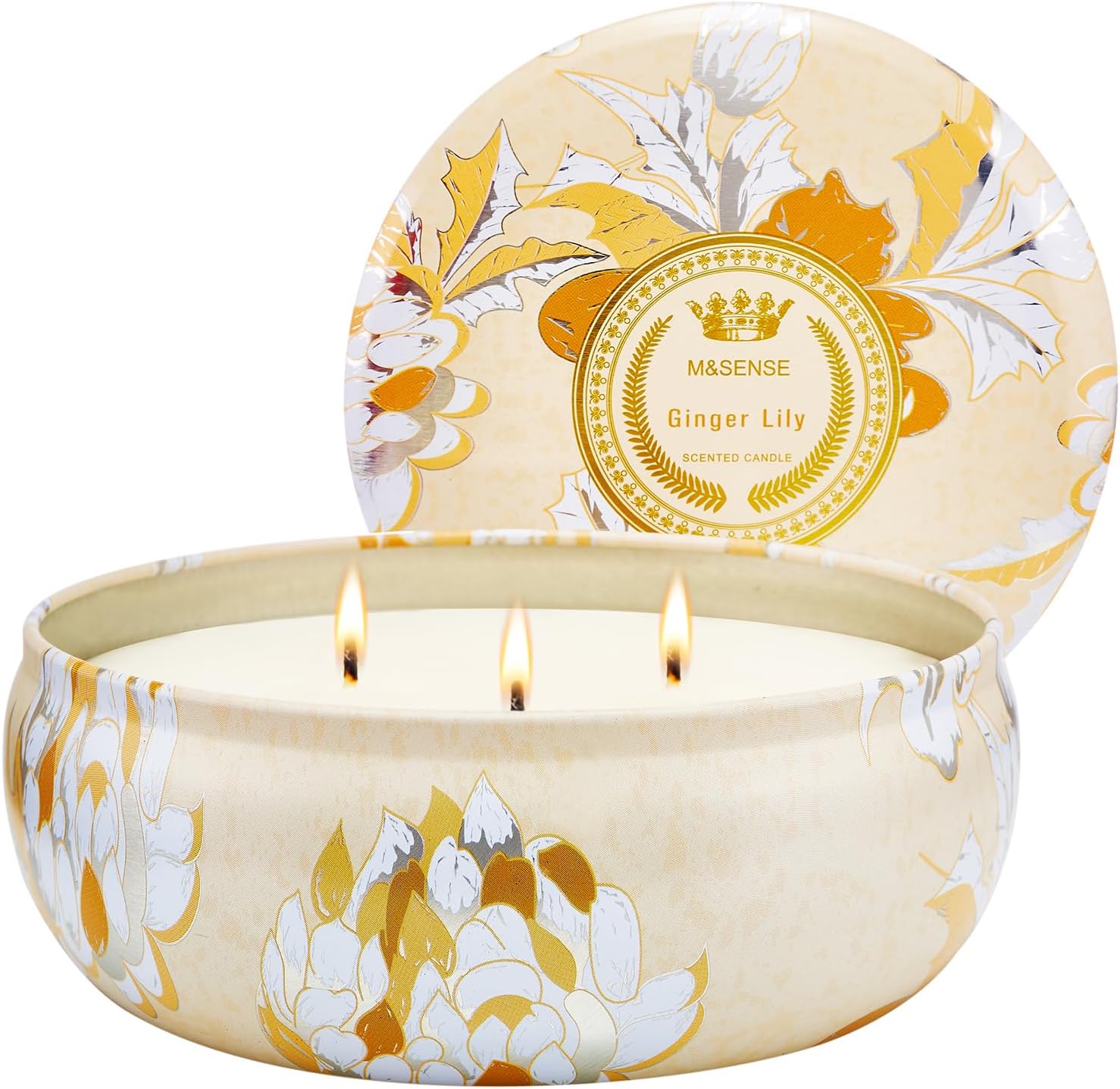 M&SENSE Ginger Lily Scented Candles, Large 3 Wick Soy Tin Candle, Over 40 Hour Burning Time, 100% Natural Vegan Wax, Relaxing Aromatherapy Aesthetic Candle Gift for Men and Women