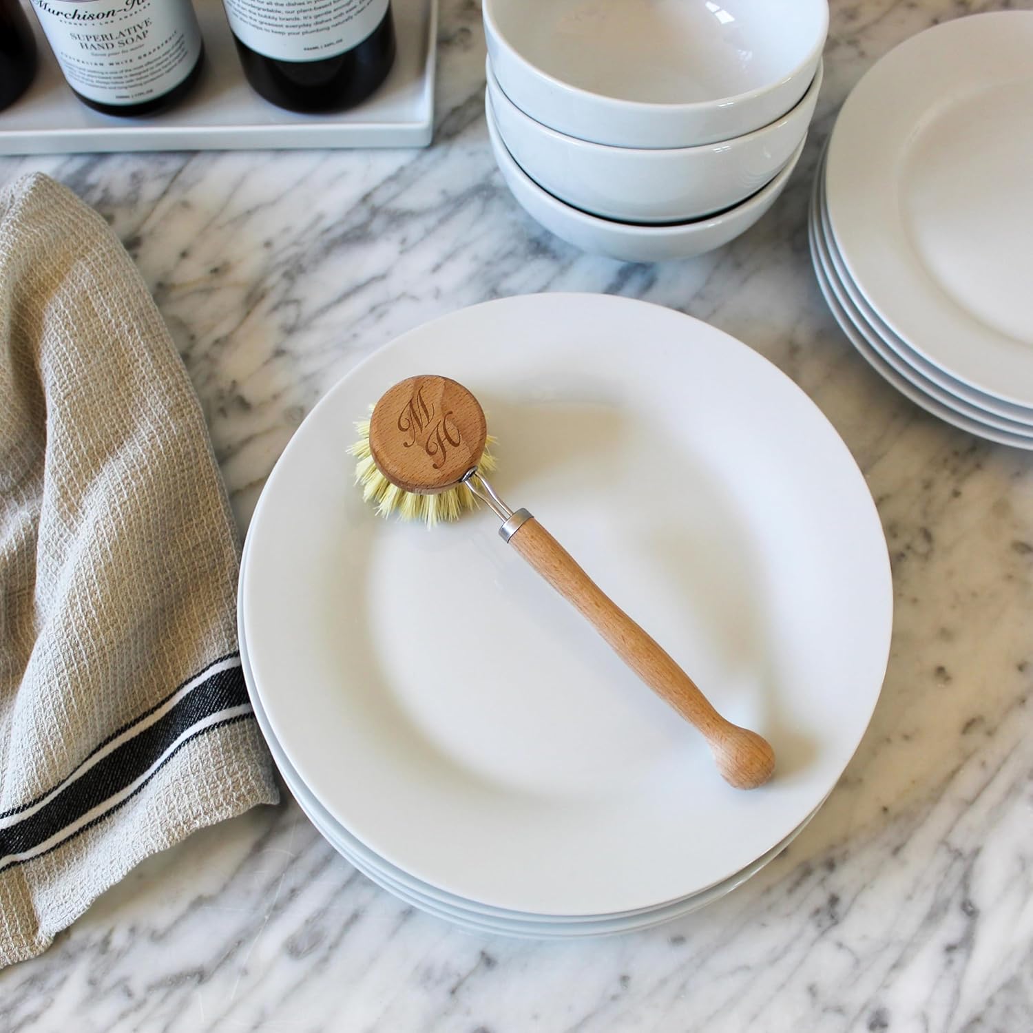 ZERO-WASTE, COMPOSTABLE WOODEN DISH BRUSH: An essential kitchen tool for any stylish kitchen, this dish brush features an ergonomic design, all-natural materials, and a replaceable cleaning head.