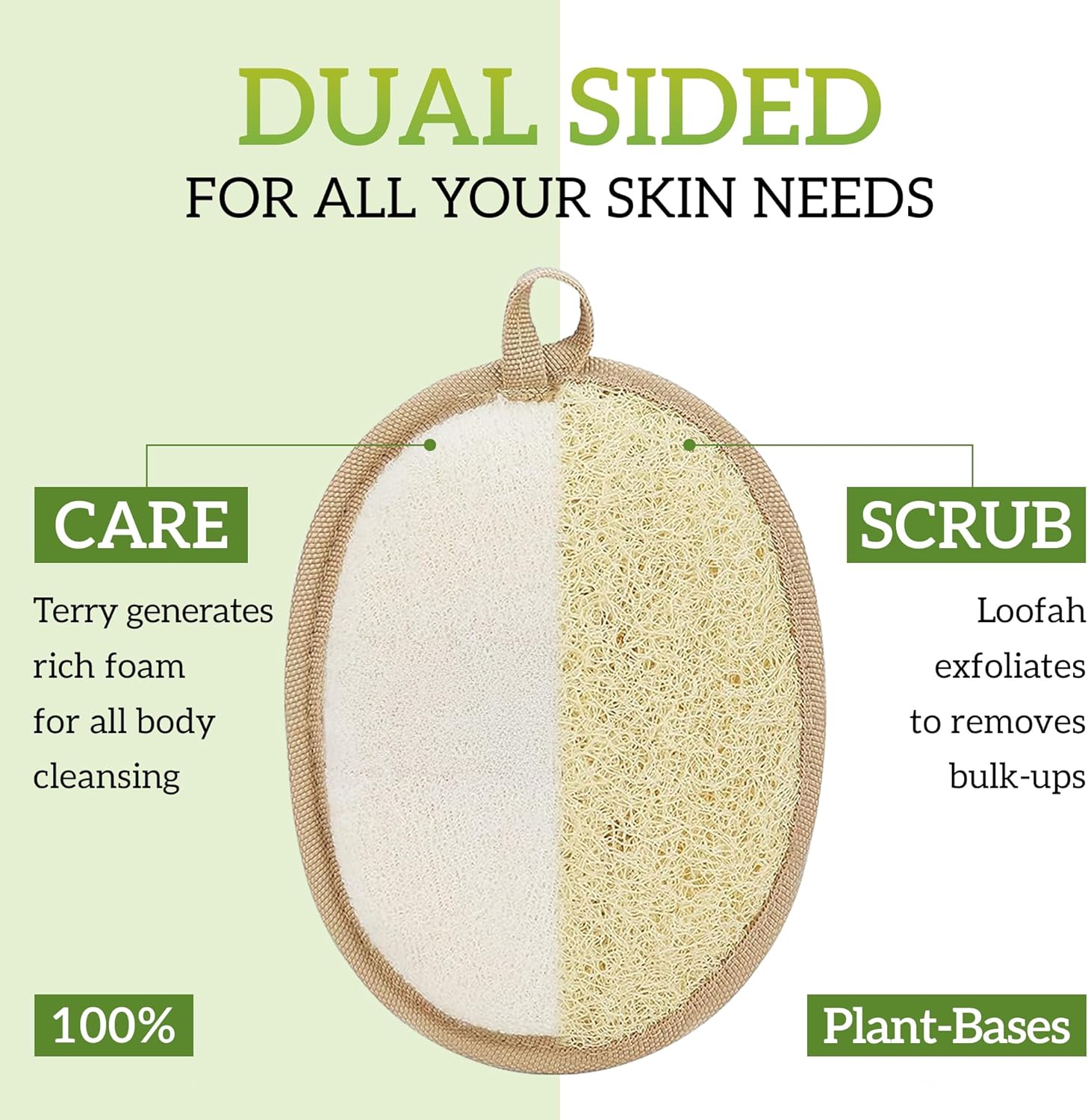 🌱𝐄𝐗𝐅𝐎𝐋𝐈𝐀𝐓𝐄 & 𝐂𝐋𝐄𝐀𝐍𝐒𝐄 𝐈𝐍 𝐎𝐍𝐄: Natural loofah for deep scrubbing, soft fabric for gentle cleansing. Smooths rough patches and helps with dry skin, keratosis, and acne.