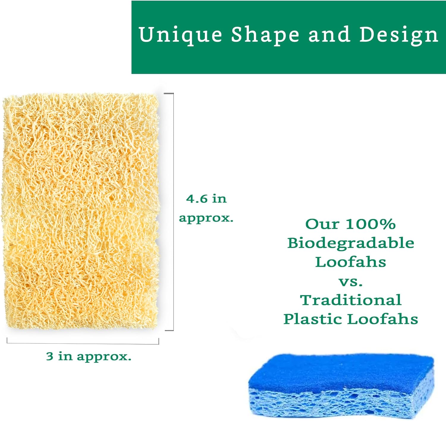 Material: Crafted from 100% natural plant-based loofah fibers.Single Layer: Cleaning on both sides for thorough cleansing.Size: Approx. 4.7 x 3 inches (12 x 7.6 cm)Pack: 10 all natural loofah kitchen spongesPackaging: Plastic-Free Kraft Paper Bag