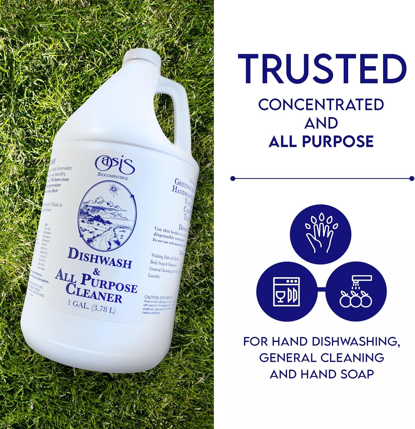 EFFECTIVE & VERSATILE CLEANER: Oasis liquid dish soap & all purpose cleaner excels at washing dishes, hand washing laundry, carpet cleaning, hand cleaning, bodywash, and as a biodegradable shampoo. Also use it as a kitchen counter cleaner, glass cleaner, pet safe cleaner, dish soap liquid, and off grid supplies for living off the grid. The multi surface cleaner & liquid dish soap is super concentrated, so a little goes a long way and produces excellent suds.