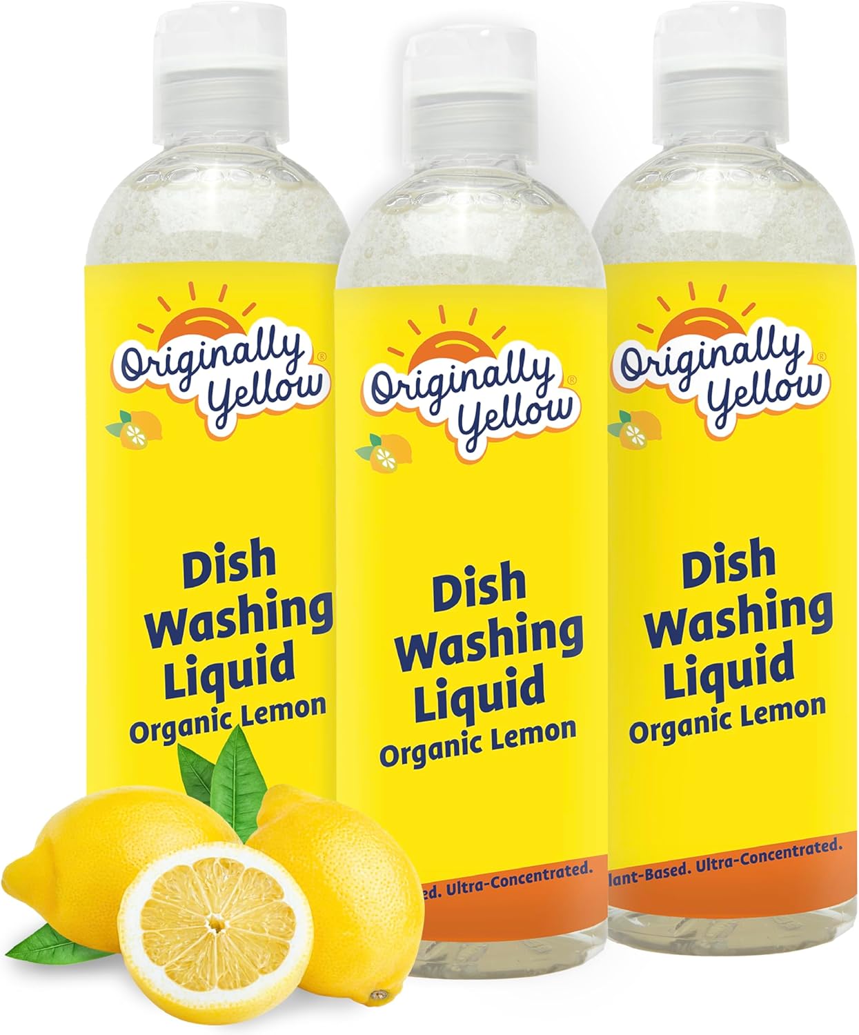 Originally Yellow Plant-Based Dish Soap Infused with Organic Lemon | Quick-Drying Dishwashing Liquid Removes Dirt and Grease | Streak-Free Dish Soap, 16 Fl Oz (3-Pack)