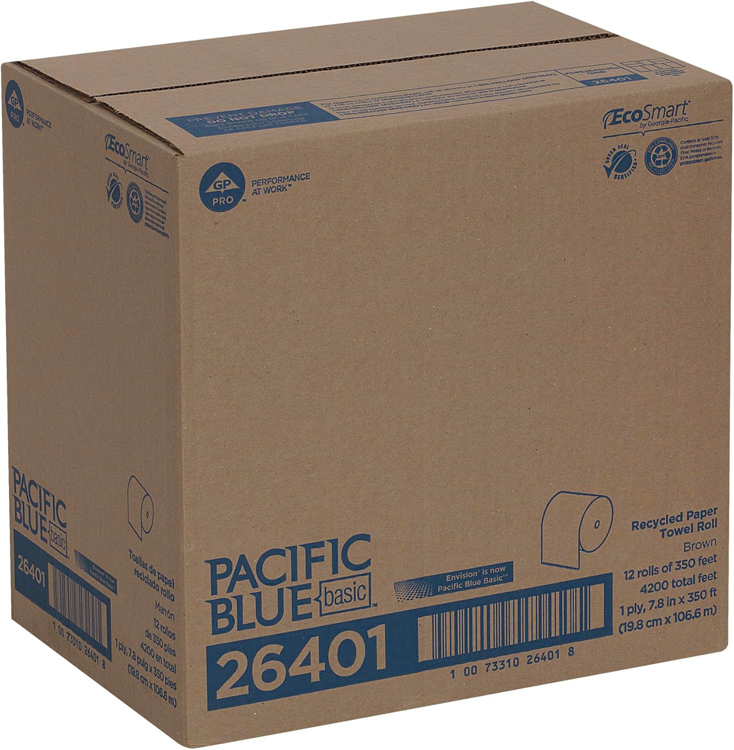 Pacific Blue Basic Recycled Paper Towel Roll by GP PRO (Georgia-Pacific), Brown, 26401, 350 Feet Per Roll, 12 Rolls Per Case