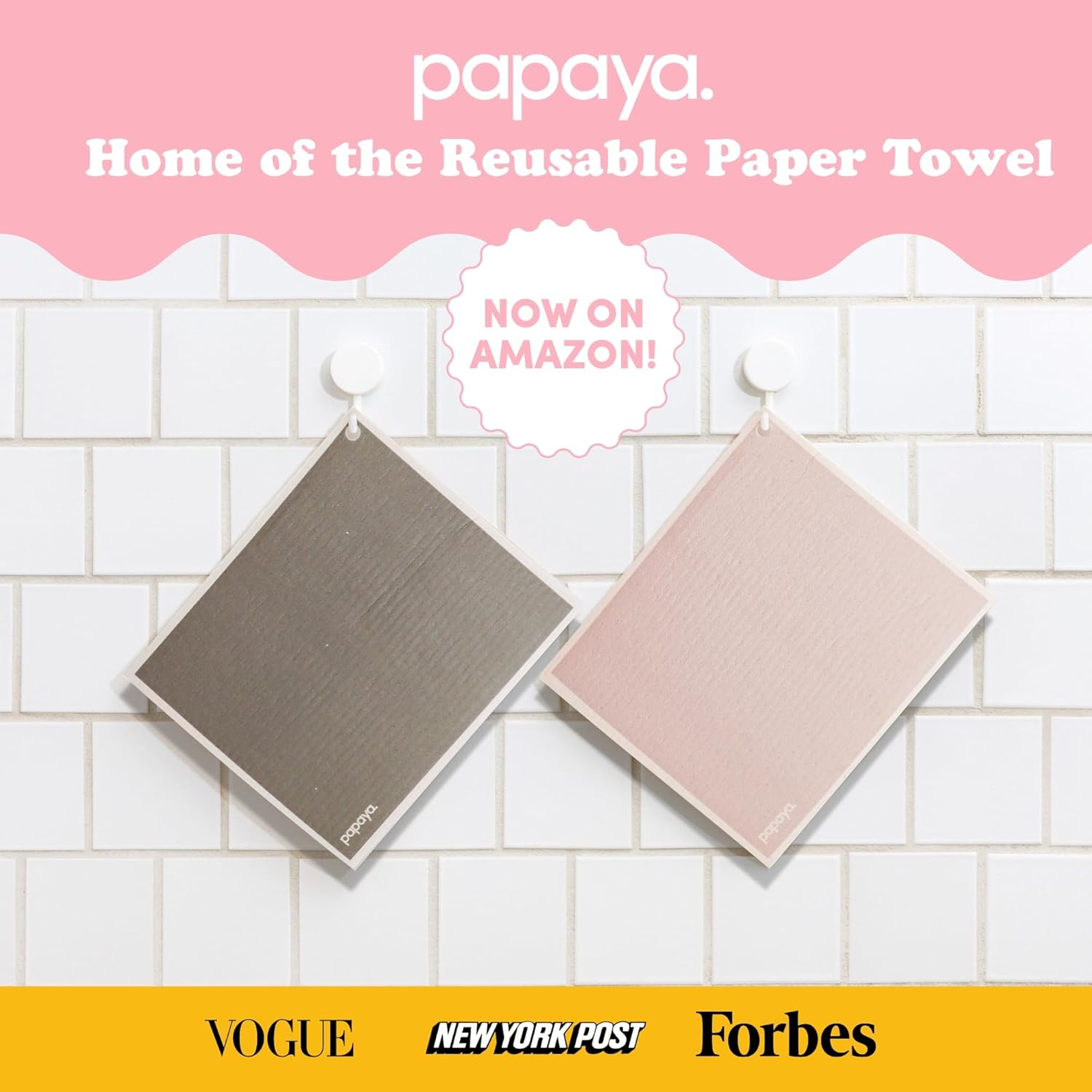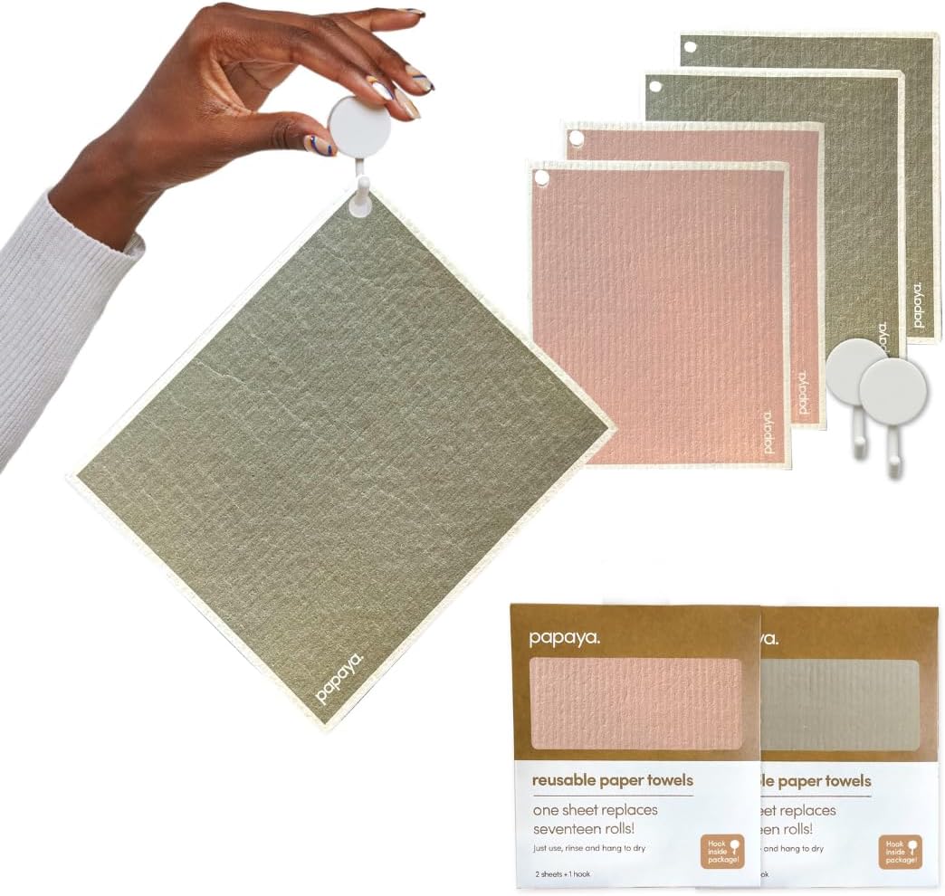 HOME OF THE REUSABLE PAPER TOWEL: 500,000+ people are loving that 1 sheet replaces 17 ROLLS of paper towels! Wet it, clean with it, then hang it to dry on the Papaya hook. Absorbs 20x its weight, 100% compostable, oh, and have you seen our lineup of beautiful designs?!