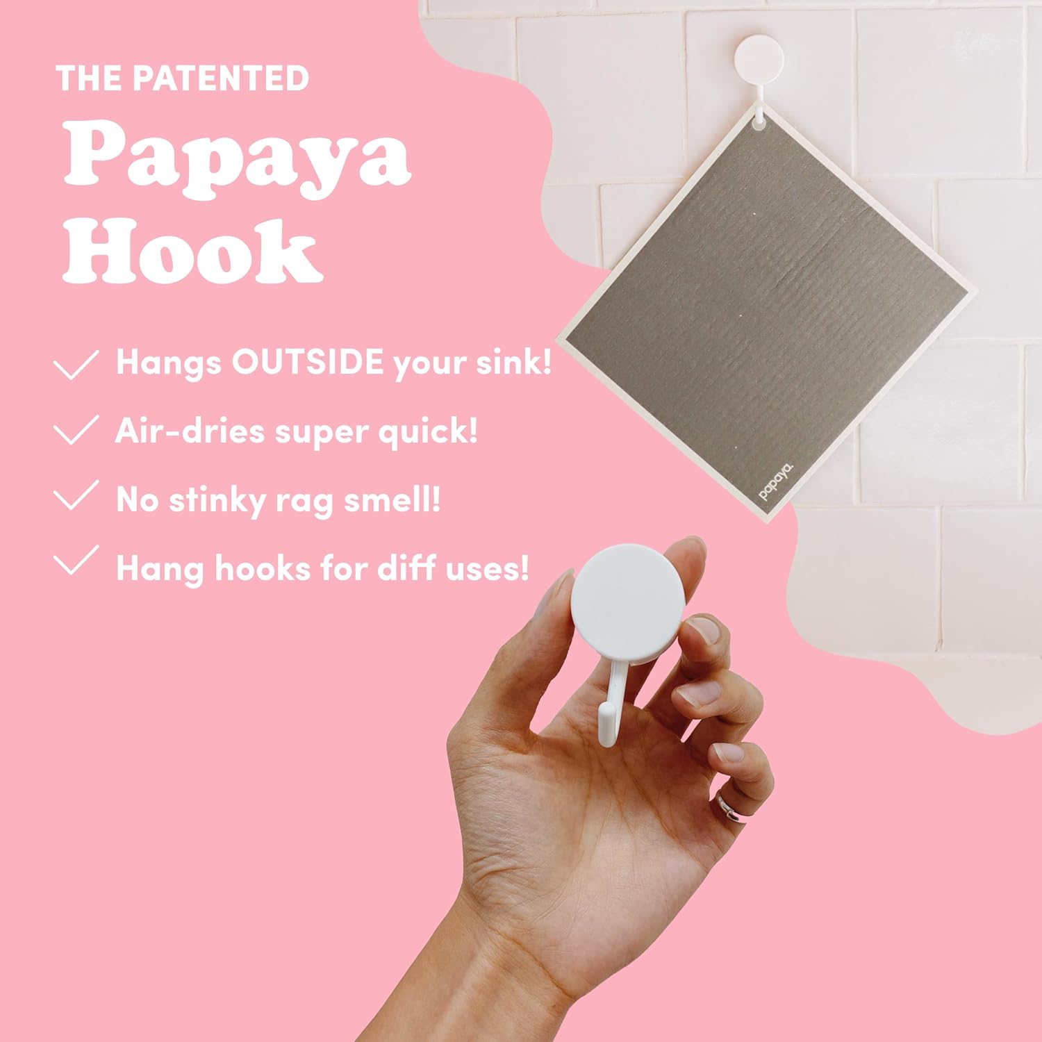 ISN’T IT JUST A RAG? Nope! Rags take forever to dry, and that moisture trapped inside is the reason they always smell. Papaya’s super quick-drying material means it doesn’t hold onto moisture, it never drips, and it won’t ever smell – especially when you hang it on the Papaya hook!