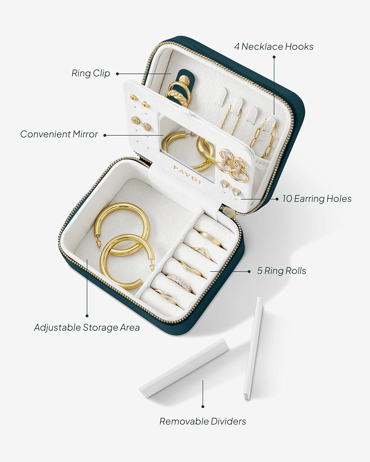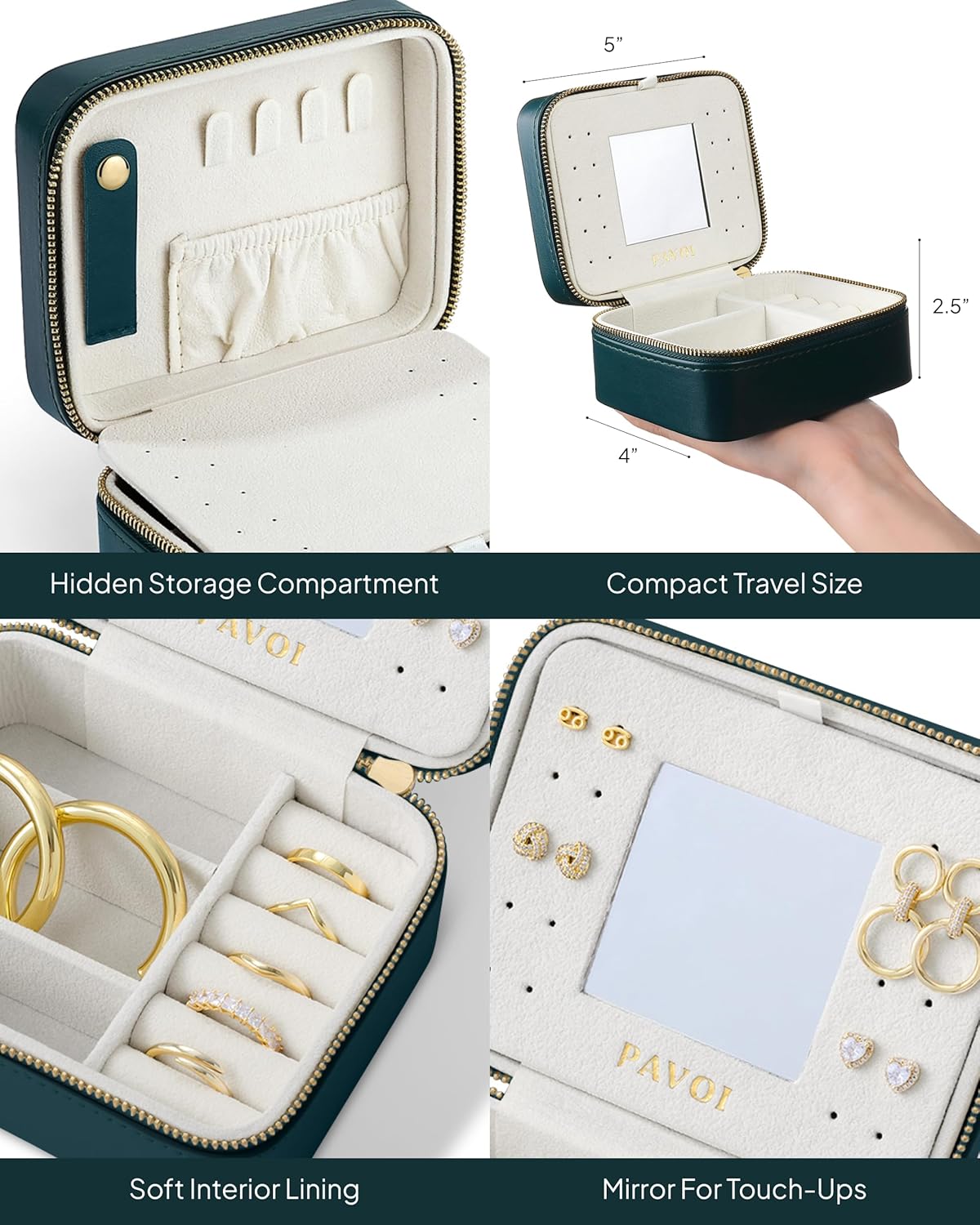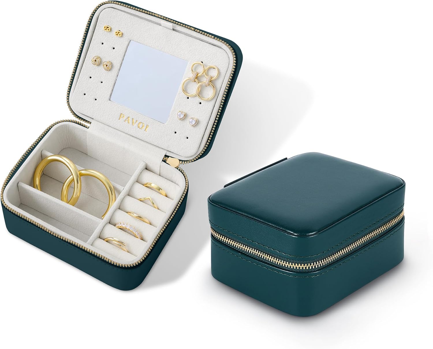 PAVOI Emerald Faux Leather Travel Jewelry Box for Women – Compact Case with Mirror – Portable Jewelry Organizer for Rings, Necklaces, Earrings, and Bracelets
