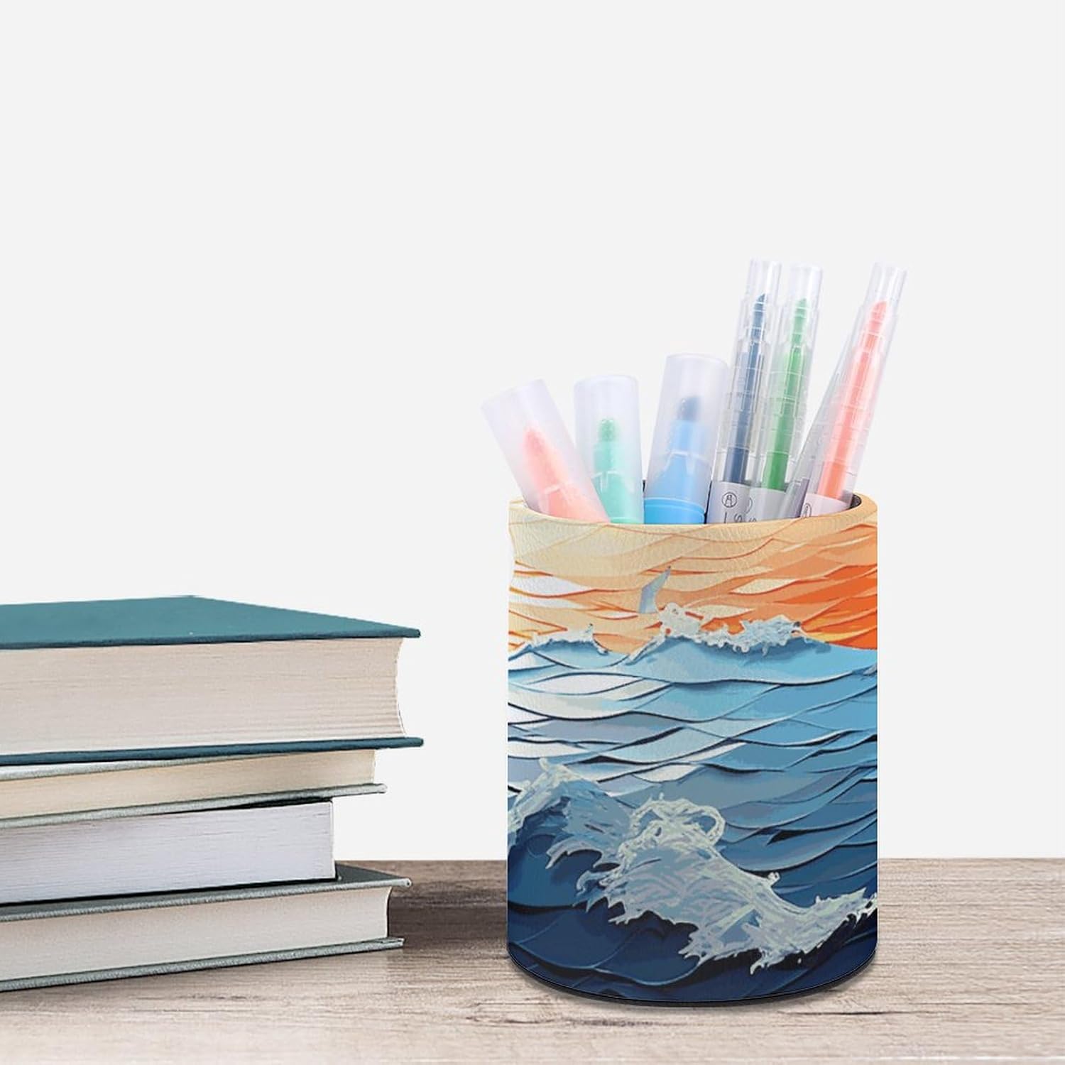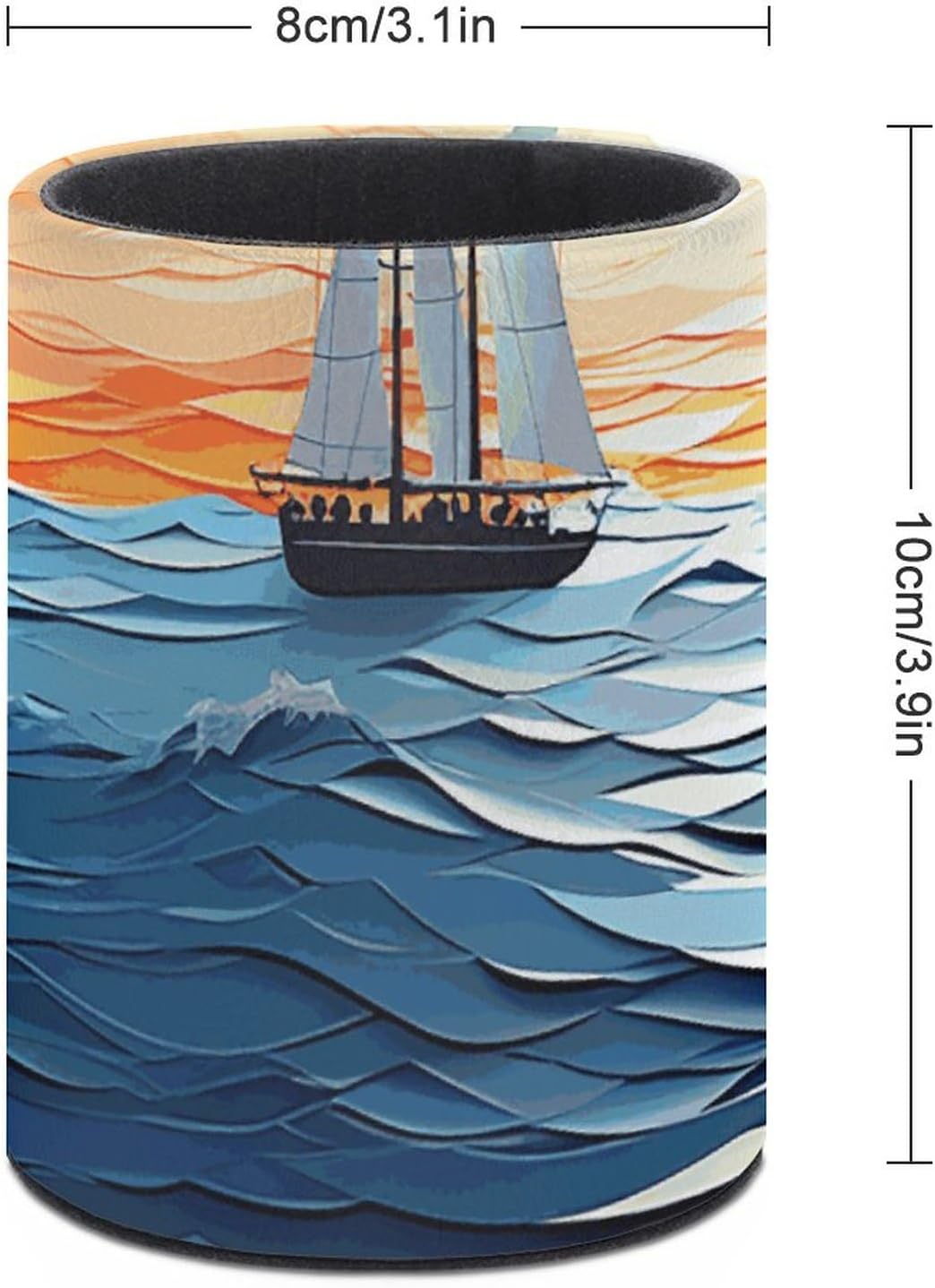 Our Ocean Waves Sailboat with Birds Maritime printed round pen holder is made of premium PU leather on the outside, which not only provides a luxurious feel but also ensures durability. The interior and bottom are made of a sturdy paper tube, providing a sustainable alternative to traditional pen holders.