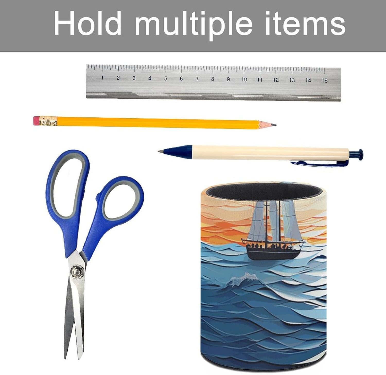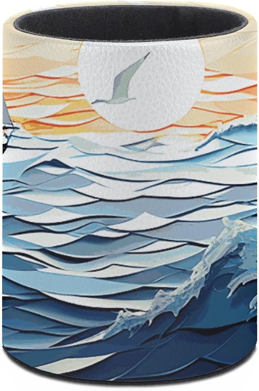 MODERN DESIGN: With its sleek rounded shape and sophisticated white stitching, this Ocean Waves Sailboat with Birds Maritime printed leather pen holder adds a touch of sophistication to any workspace. Its simple design blends seamlessly into modern and classic decors