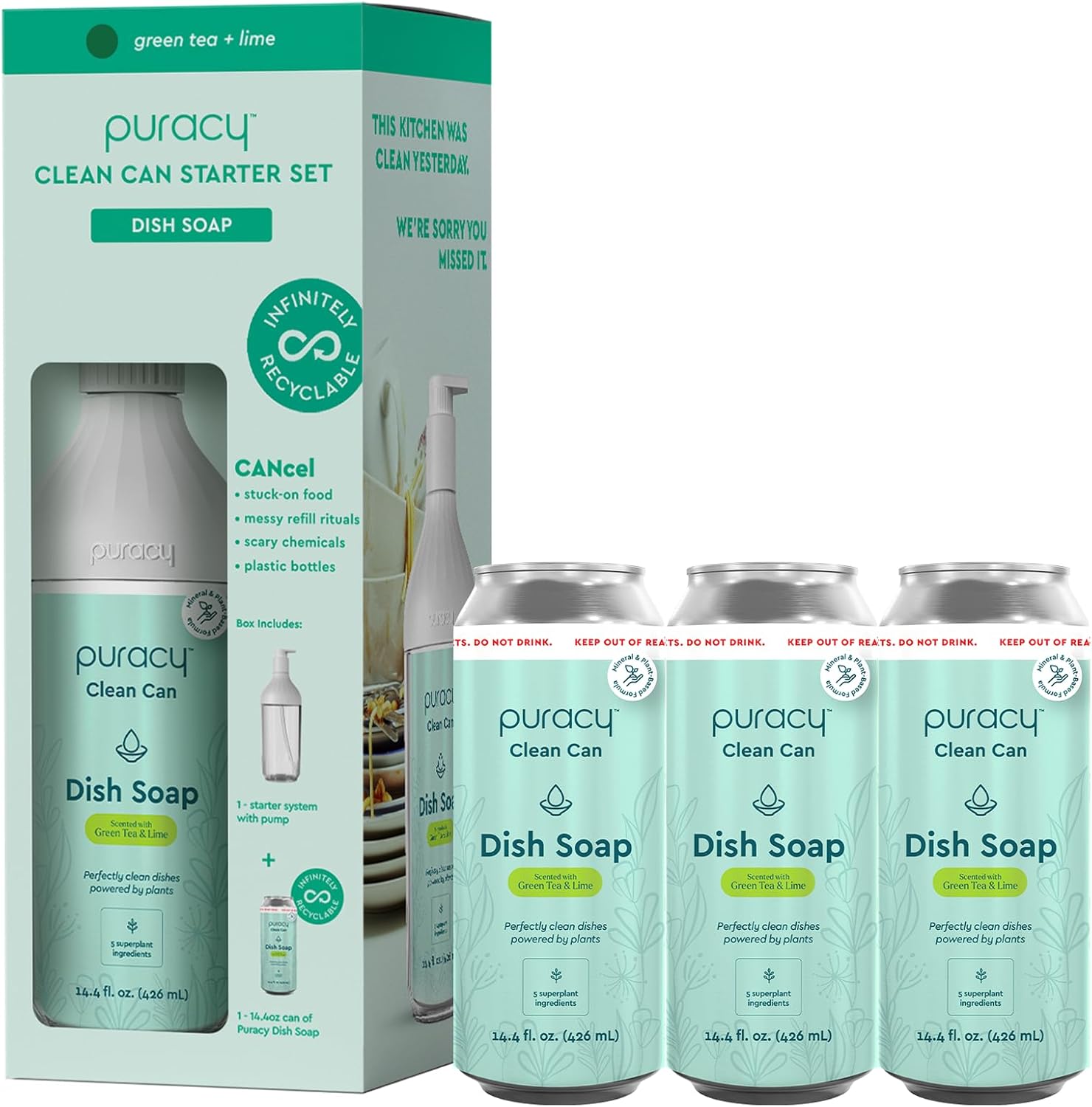 Puracy Dish Soap Clean Can Bundle – Starter Set and 3 Pack Refill, Non-Toxic Dish Soap Plant-Powered Dishwashing Soap, Natural Dish Soap Liquid – Green Tea & Lime