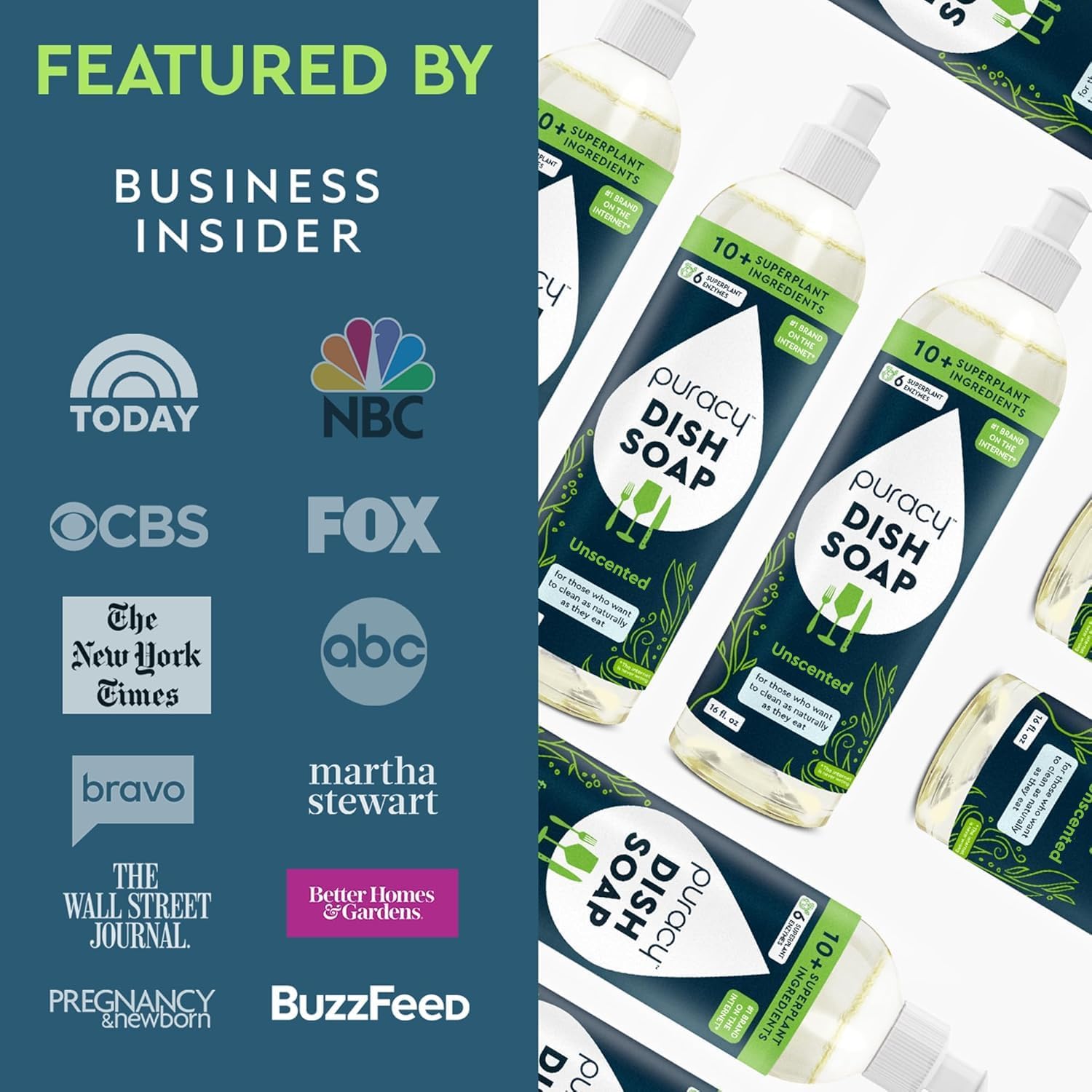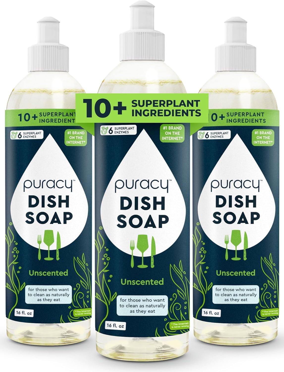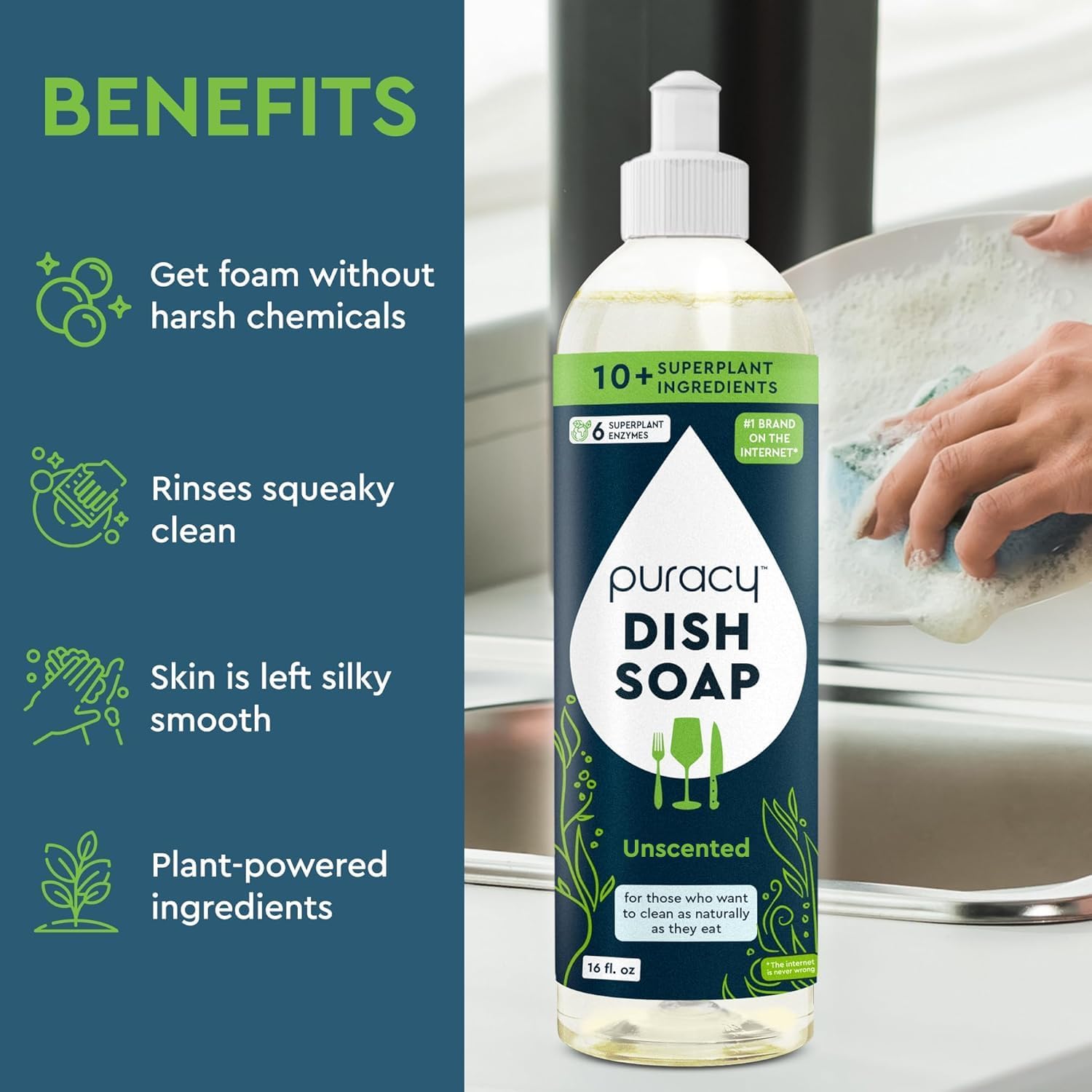 Puracy Natural Dish Soap Packs- Unscented Skin-Softening Plant-Based Dishwashing Soap, Non-Toxic Dish Soap, Fragance Free Organic Liquid Dishwashing Detergent Soap (Unscented, 16 fl oz, 3 Pack)