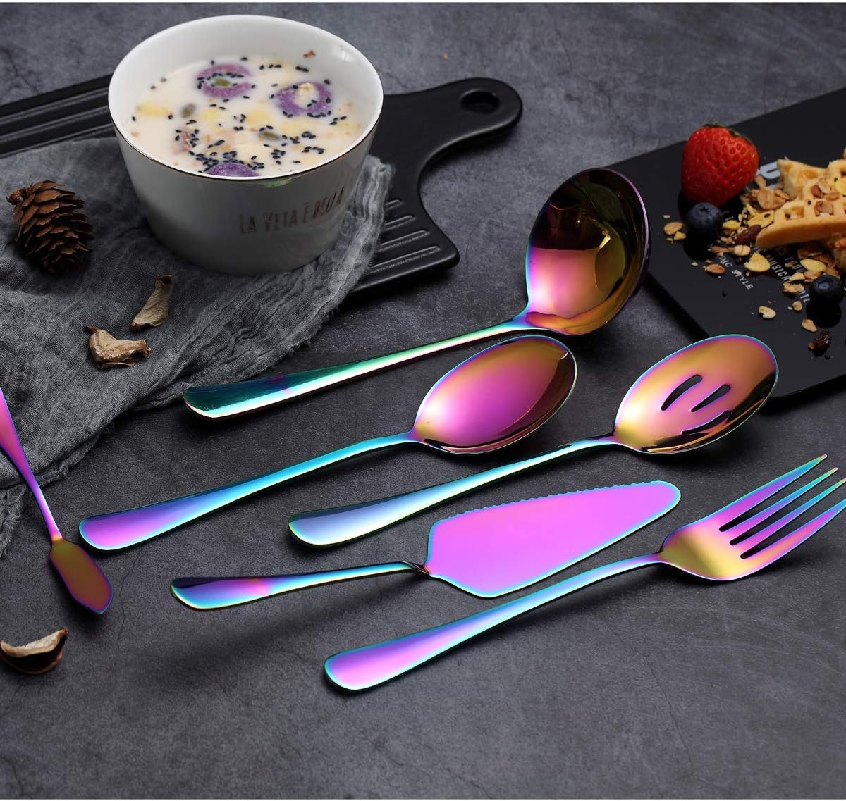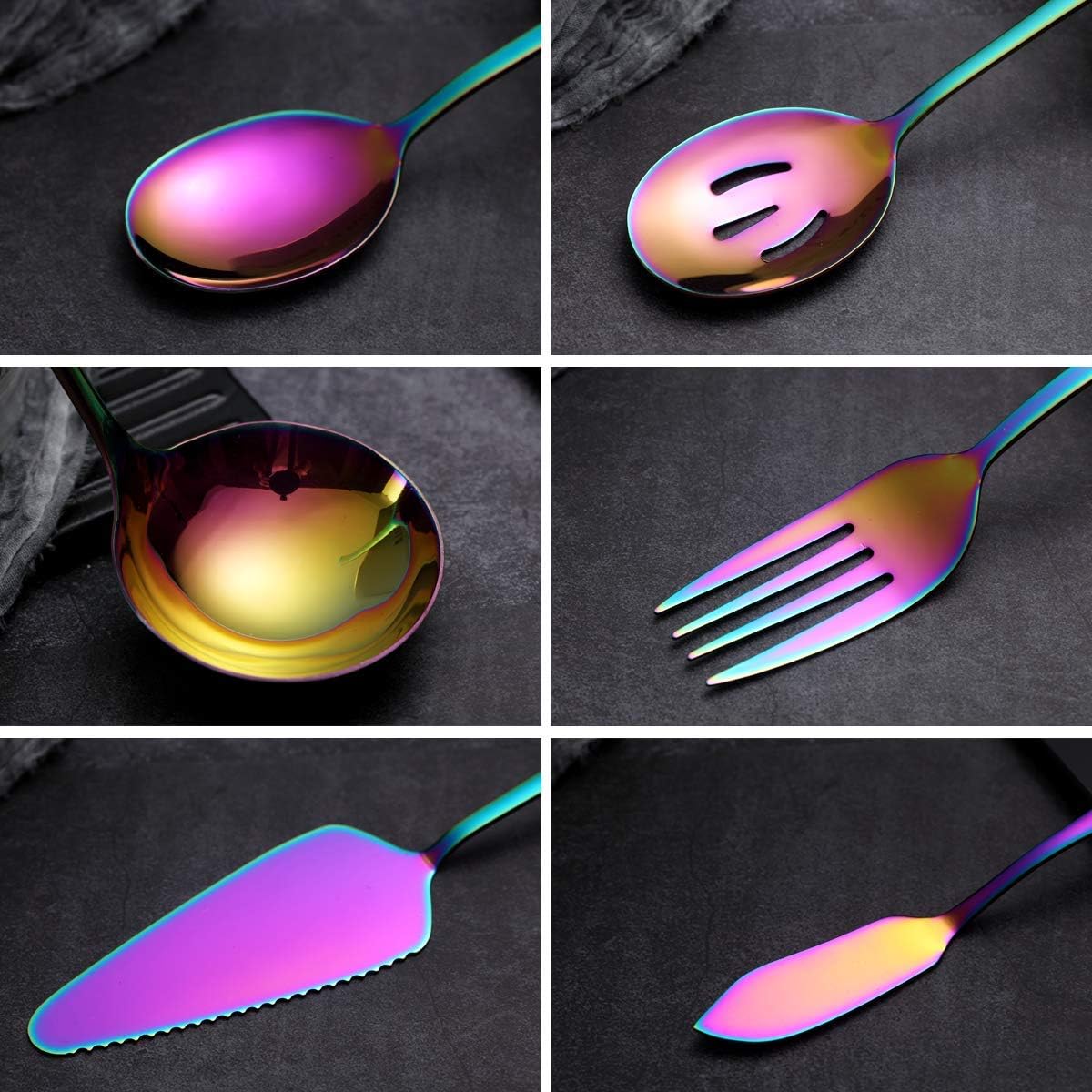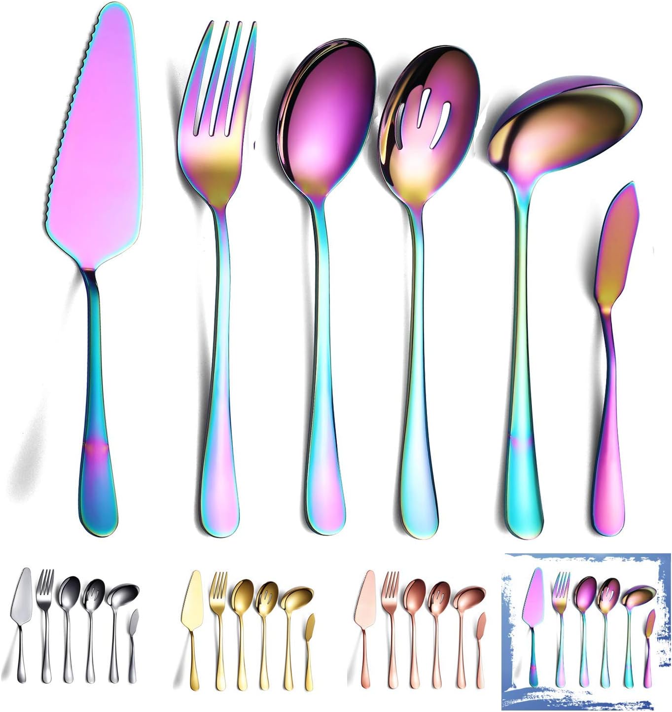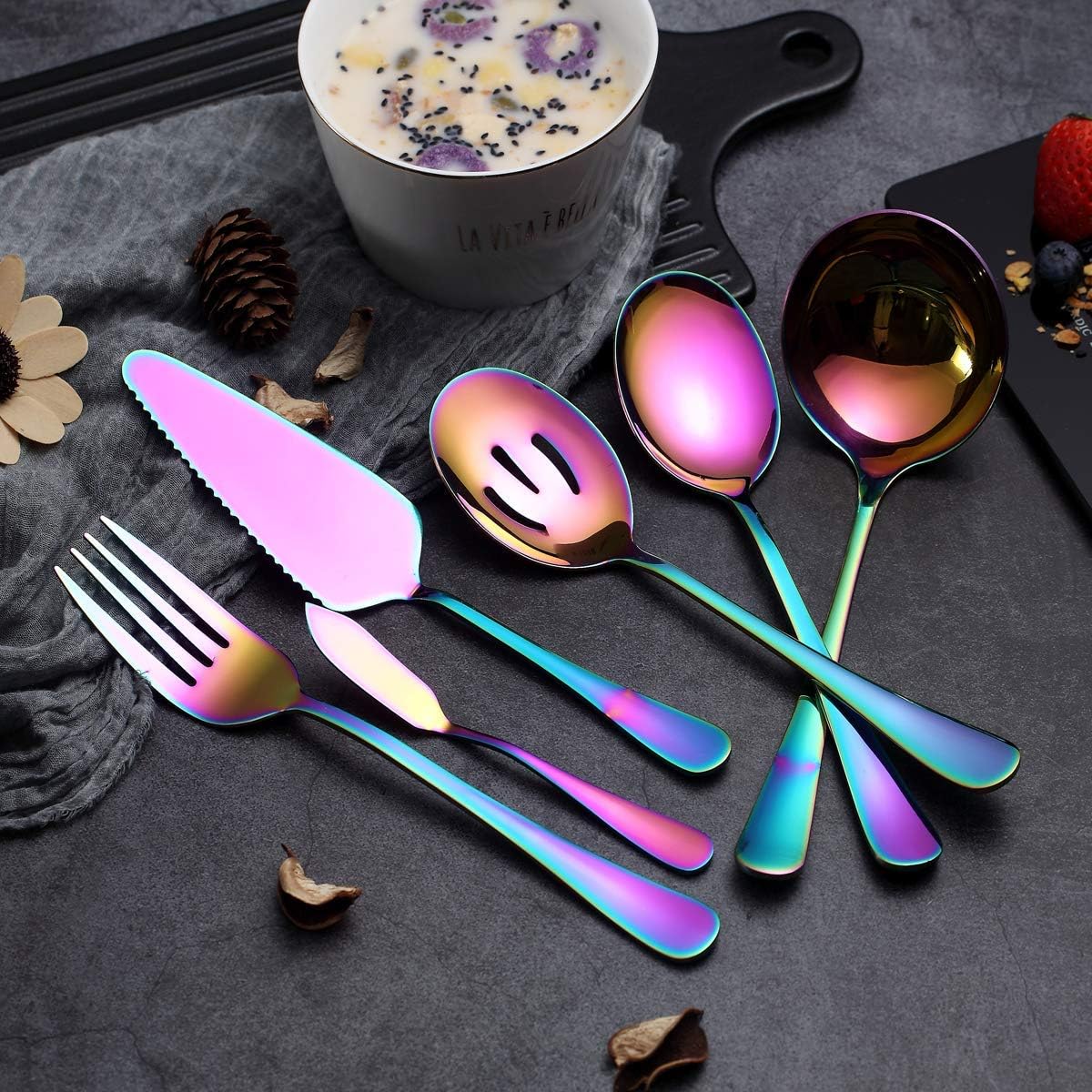Rainbow Serving Spoons Set 6 Pieces, Serving Utensils Set Include Cake Server Slotted Spoon Serving Spoon Serving Fork Ladle Butter Knife Spreader Serving Set Dishwasher Safe
