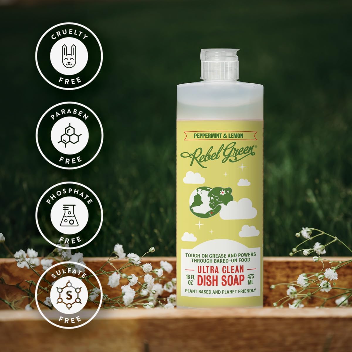 Rebel Green Super Deluxe Dish Soap – Natural Dishwashing Soap – Liquid Dish Detergent – Sustainable Dish Liquid Scented with Peppermint & Lemon – (16 oz Bottles, 1 Pack)